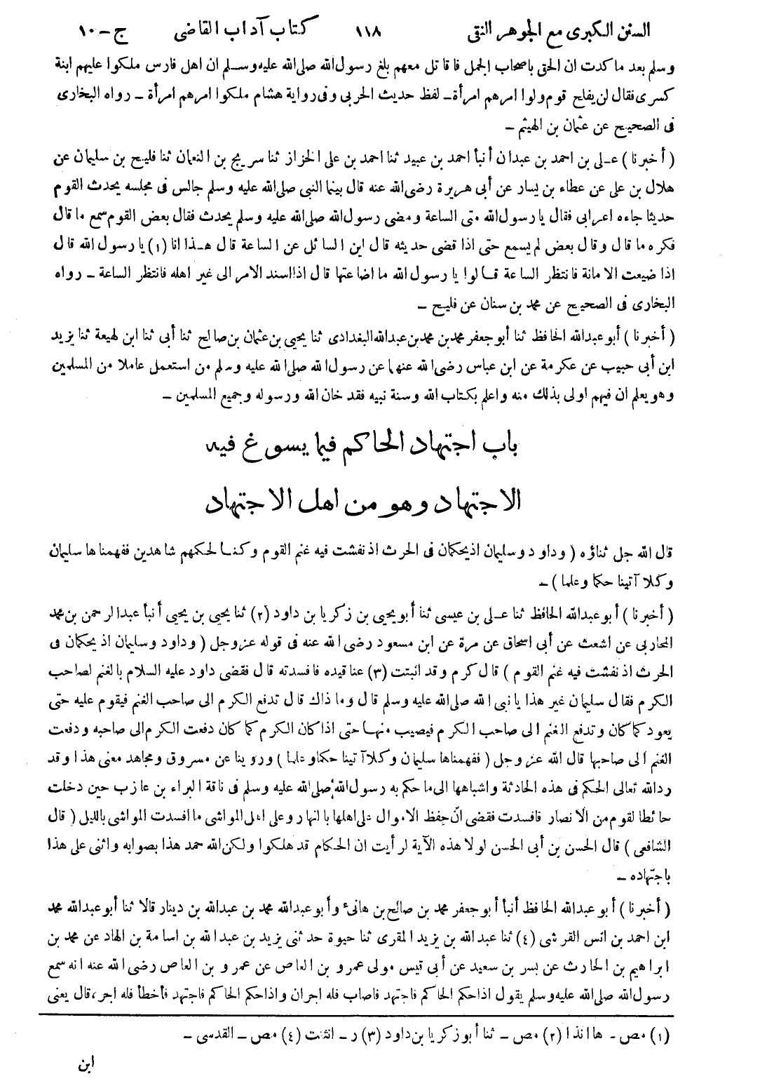 (أخبرنا) أبو عبد الله الحافظ ثنا أبو جعفر محمد بن محمد بن عبد الله البغدادي ثنا يحيى بن عثمان بن صالح ثنا أبى ثنا ابن لهيعة ثنا يزيد ابن أبى حبيب عن عكرمة عن ابن عباس رضى الله عنهما عن رسول الله صلى الله عليه وسلم من استعمل عاملا من المسلمين وهو يعلم ان فيهم اولى بذلك منه واعلم بكتاب الله وسنة نبيه فقد خان الله ورسوله وجميع المسلمين باب اجتهاد الحاكم فيما يسوغ فيه الاجتهاد وهو من اهل الاجتهاد قال الله جل ثناؤه (وداود وسليمان إذ يحكمان في الحرث إذ نفشت فيه غنم القوم وكنا لحكمهم شاهدين ففهمناها سليمان