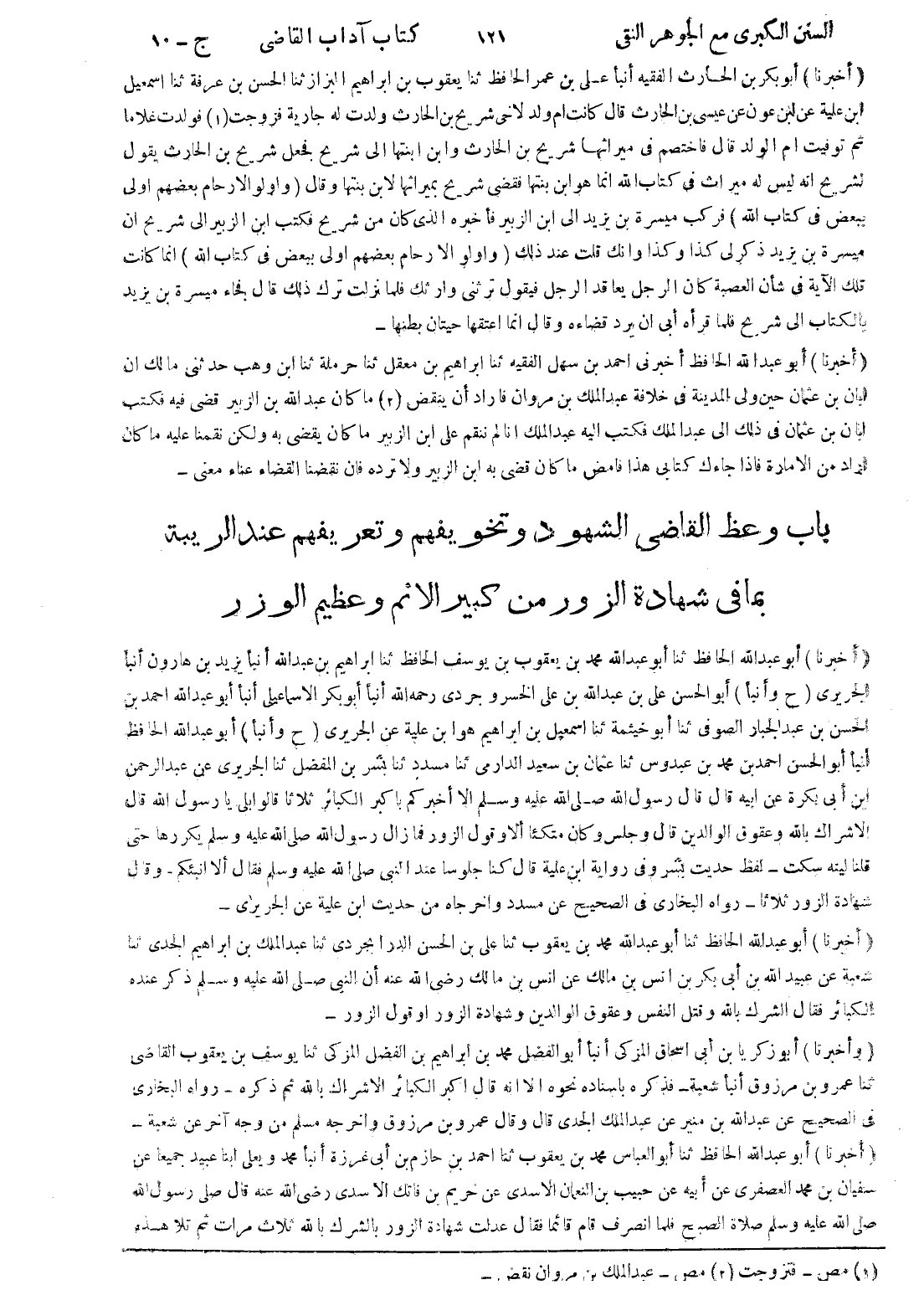 (أخبرنا) أبو عبد الله الحافظ أخبرني احمد بن سهل الفقيه ثنا ابراهيم بن معقل ثنا حرملة ثنا ابن وهب حدثنى مالك ان ابان بن عثمان حين ولى المدينة في خلافة عبد الملك بن مروان فاراد أن ينقض (2) ما كان عبد الله بن الزبير قضى فيه فكتب ابان بن عثمان في ذلك إلى عبد الملك فكتب إليه عبد الملك انا لم ننقم على ابن الزبير ما كان يقضى به ولكن نقمنا عليه ما كان اراد من الامارة فإذا جاءك كتابي هذا فامض ما كان قضى به ابن الزبير ولا ترده فان نقضنا القضاء عناء معنى باب وعظ القاضى الشهود وتخويفهم وتعريفهم عند الريبة بما في شهادة الزور من كبير الاثم وعظيم الوزر