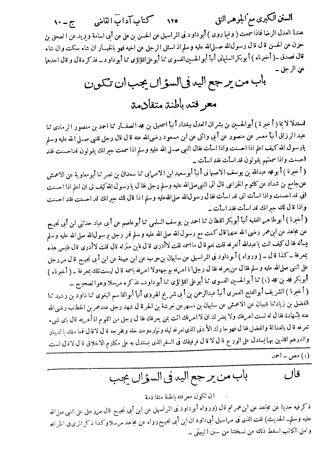 قال باب من يرجع إليه في السؤال يجب ان تكون معرفته باطنة متقادمة ذكر فيه حديثا عن مجاهد عن ابن عمر ثم قال (ورواه أبو داود في المراسيل عن ابن أبى نجيح قال مر رجل على النبي صلى الله عليه وسلم - الحديث) قلت الذى في مراسيل أبى داود ان ابن أبى نجيح رواه عن مجاهد مرسلا وكذا ذكر المزى في اطرافه ولعل الكات ب اسقط ذلك من نسختنا من سنن البيهقى -
