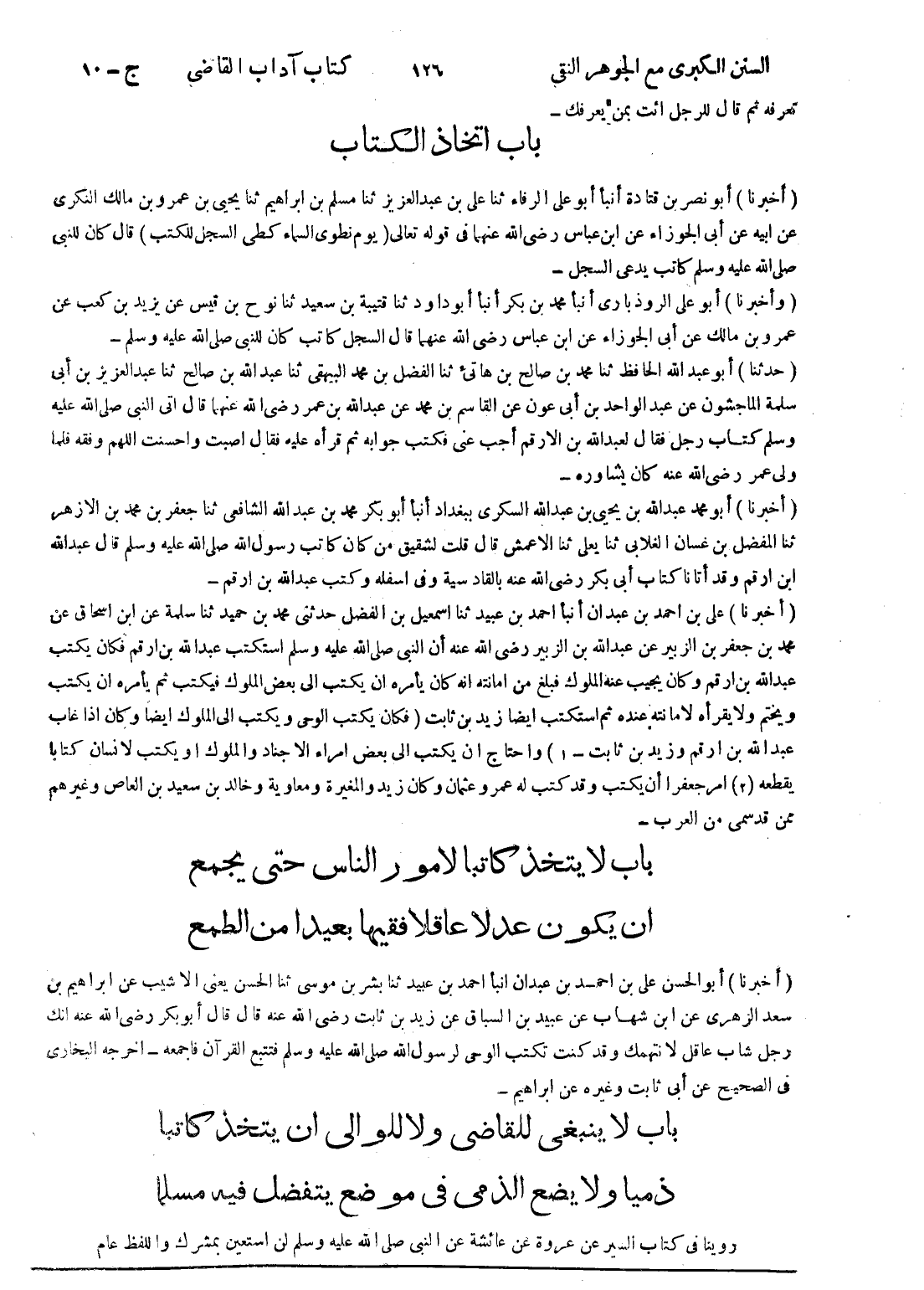 (أخبرنا) أبو الحسن على بن احمد بن عبدان انبأ احمد بن عبيد ثنا بشر بن موسى ثنا الحسن يعنى الاشيب عن ابراهيم بن سعد الزهري عن ابن شهاب عن عبيد بن السباق عن زيد بن ثابت رضى الله عنه قال قال أبو بكر رضى الله عنه انك رجل شاب عاقل لا نتهمك وقد كنت تكتب الوحى لرسول الله صلى الله عليه وسلم فتتبع القرآن فاجمعه - اخرجه البخاري في الصحيح عن أبى ثابت وغيره عن ابراهيم باب لا ينبغى للقاضى ولا للوالى ان يتخذ كاتبا ذميا ولا يضع الذمي في موضع يتفضل فيه مسلما روينا في كتاب السير عن عروة عن عائشة عن النبي صلى الله عليه وسلم لن استعين بمشرك واللفظ عام