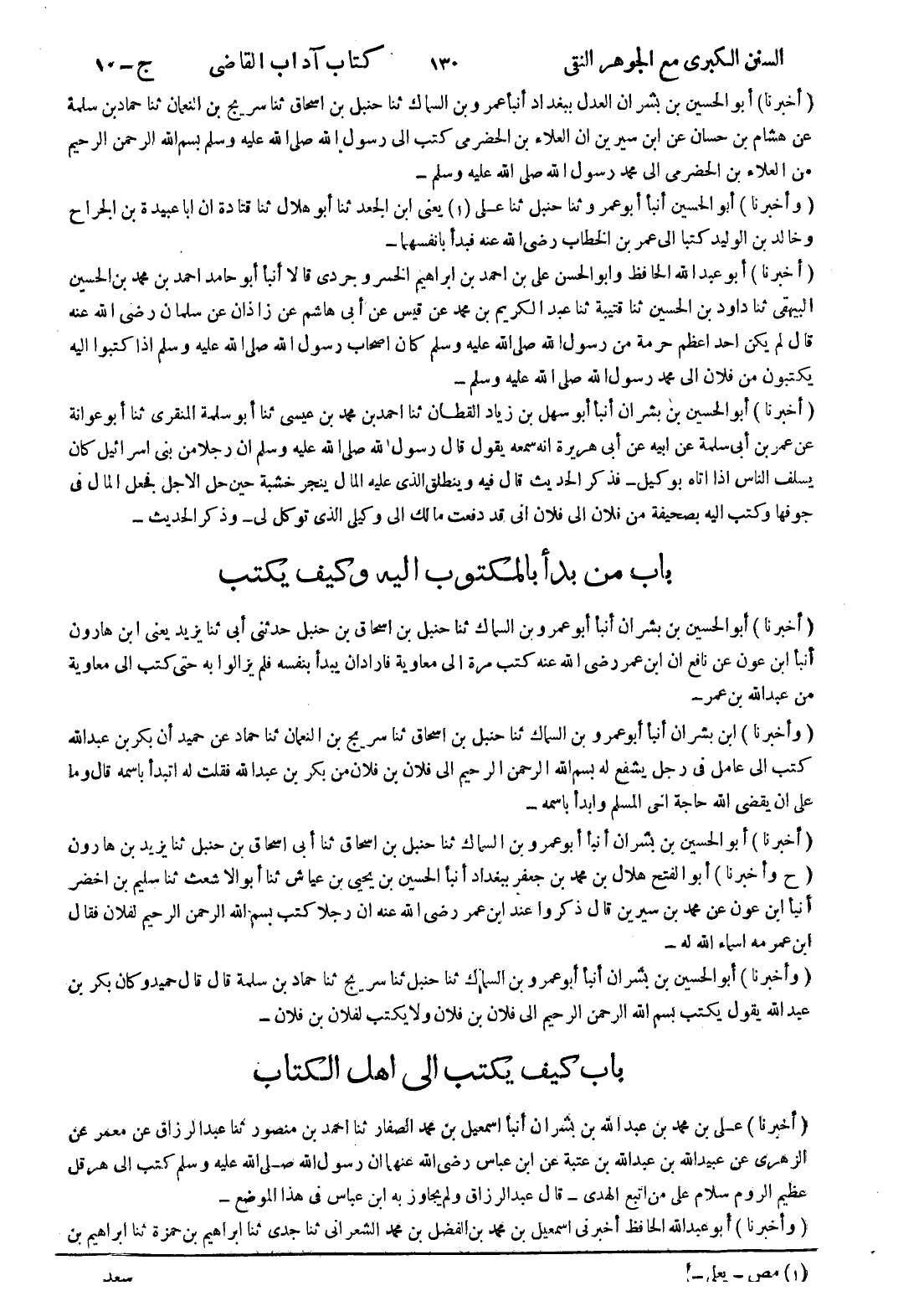(ح وأخبرنا) أبو الفتح هلال بن محمد بن جعفر ببغداد أنبأ الحسين بن يحيى بن عياش ثنا أبو الأشعث ثنا سليم بن اخضر أنبأ ابن عون عن محمد بن سيرين قال ذكروا عند ابن عمر رضى الله عنه ان رجلا كتب بسم الله الرحمن الرحيم لفلان فقال ابن عمر مه اسماء الله له (وأخبرنا) أبو الحسين بن بشران أنبأ أبو عمرو بن السماك ثنا حنبل ثنا سريج ثنا حماد بن سلمة قال قال حميد وكان بكر بن عبد الله يقول يكتب بسم الله الرحمن الرحيم إلى فلان بن فلان ولا يكتب لفلان بن فلان باب كيف يكتب إلى اهل الكتاب