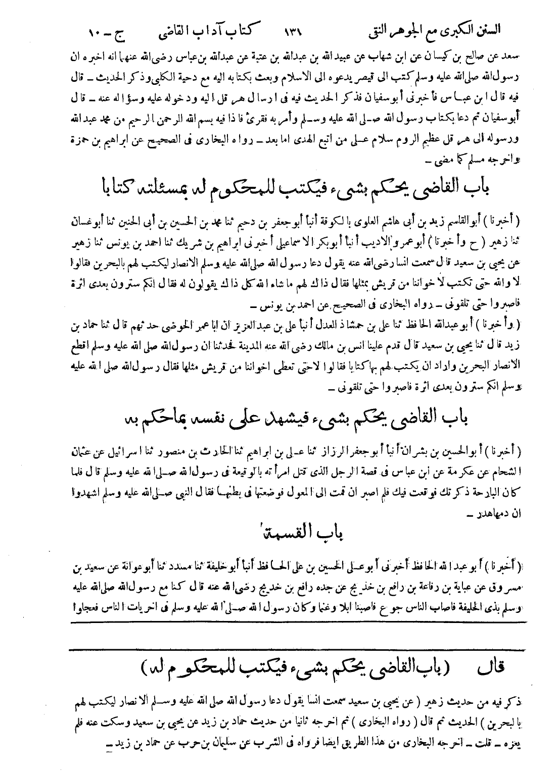 قال (باب القاضى يحكم بشئ فيكتب للمحكوم له) ذكر فيه من حديث زهير (عن يحيى بن سعيد سمعت انسا يقول دعا رسول الله صلى الله عليه وسلم الانصار ليكتب لهم بالبحرين) الحديث ثم قال (رواه البخاري) ثم اخرجه ثانيا من حديث حماد بن زيد عن يحيى بن سعيد وسكت عنه فلم يعزه - قلت - اخرجه البخاري من هذا الطريق ايضا فرواه في الشرب عن سليمان بن حرب عن حماد بن زيد -