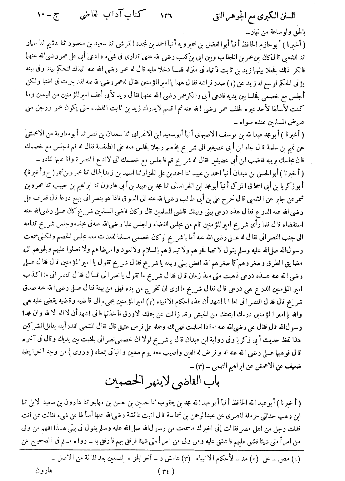 (أخبرنا) أبو حازم الحافظ أنبأ أبو الفضل بن خميرويه أنبأ احمد بن نجدة القرشى ثنا سعيد بن منصور ثنا هشيم ثنا سيار ثنا الشعبى قال كان بين عمر بن الخطاب وبين ابى بن كعب رضى الله عنهما تدارى في شئ وادعى أبى على عمر رضى الله عنهما فانكر ذلك فجعلا بينهما زيد بن ثابت فأتياه في منزله فلما دخلا عليه قال له عمر رضى الله عنه اتيناك لتحكم بيننا وفي بيته يؤتى الحكم فوسع له زيد عن (1) صدر فراشه فقال ههنا يا امير المؤمنين فقال له عمر رضى الله عنه لقد جرت في الفتيا ولكن أجلس مع خصمى فجلسا بين يديه فادعى أبى وانكر عمر رضى الله عنهما فقال زيد لابي أعف أمير المؤمنين من اليمين وما كنت لاسألها لاحد غيره فحلف عمر رضى الله عنه ثم اقسم لا يدرك زيد بن ثابت القضاء حتى يكون عمر ورجل من عرض المسلمين عنده سواء