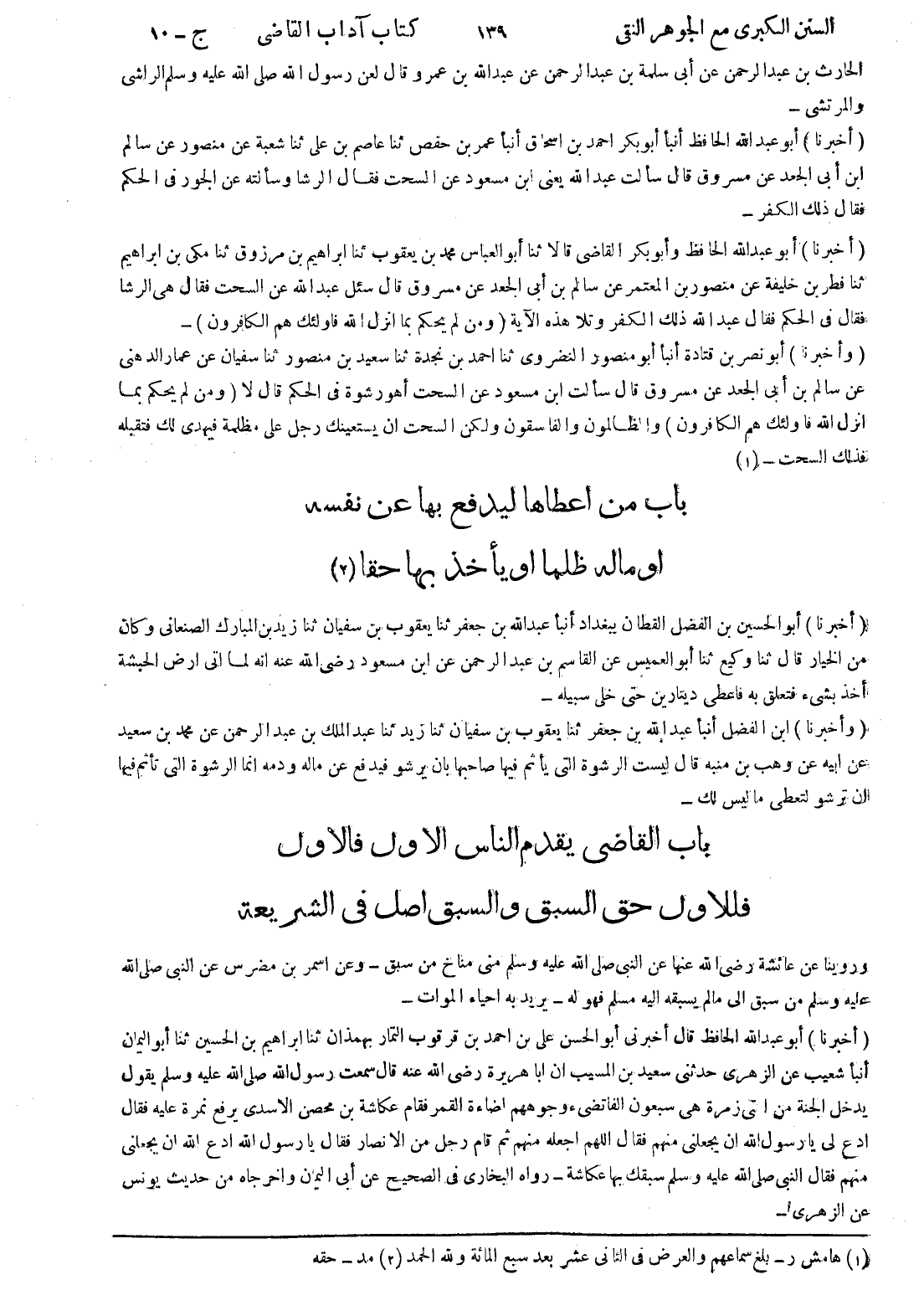 (أخبرنا) أبو الحسين بن الفضل القطان ببغداد أنبأ عبد الله بن جعفر ثنا يعقوب بن سفيان ثنا زيد بن المبارك الصنعانى وكان من الخيار قال ثنا وكيع ثنا أبو العميس عن القاسم بن عبد الرحمن عن ابن مسعود رضى الله عنه انه لما اتى ارض الحبشة أخذ بشئ فتعلق به فاعطى دينارين حتى خلى سبيله (وأخبرنا) ابن الفضل أنبأ عبد الله بن جعفر ثنا يعقوب بن سفيان ثنا زيد ثنا عبد الملك بن عبد الرحمن عن محمد بن سعيد عن ابيه عن وهب بن منبه قال ليست الرشوة التى يأثم فيها صاحبها بان يرشو فيدفع عن ماله ودمه انما الرشوة التى تأثم فيها ان ترشو لتعطى ما ليس لك باب القاضى يقدم الناس الاول فالاول فللاول حق السبق والسبق اصل في الشريعة وروينا عن عائشة رضى الله عنها عن النبي صلى الله عليه وسلم منى مناخ من سبق - وعن اسمر بن مضرس عن النبي صلى الله عليه وسلم من سبق إلى ما لم يسبقه إليه مسلم فهو له - يريد به احياء الموات
