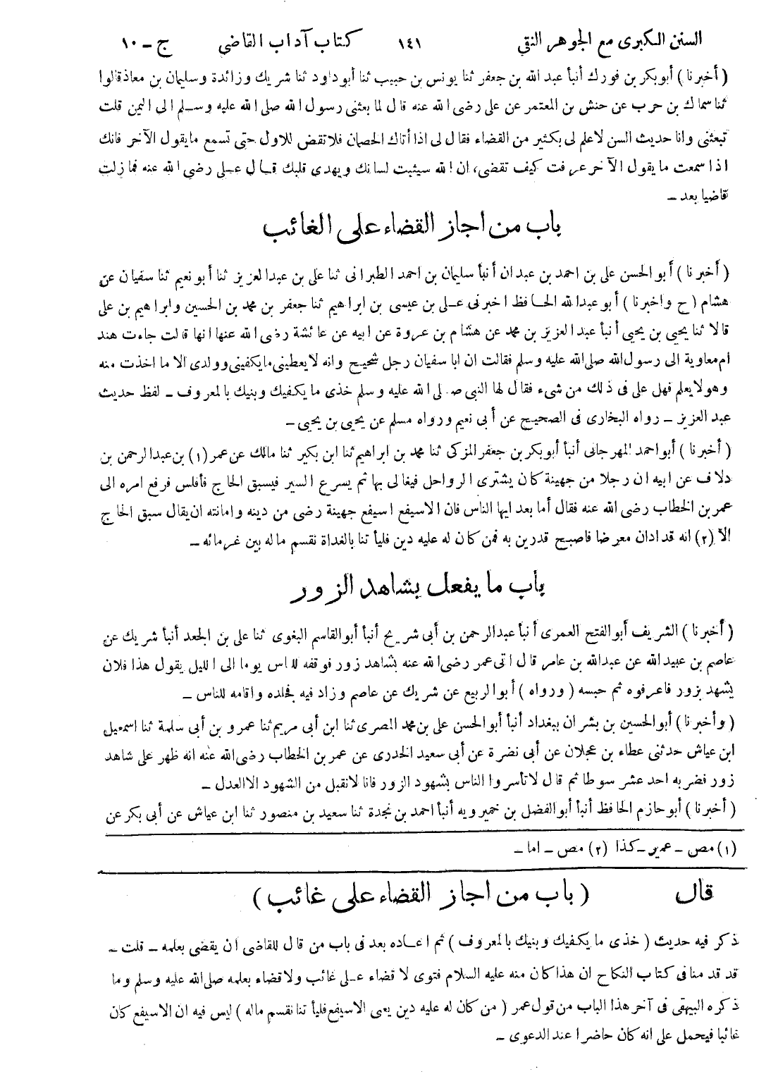 قال (باب من اجاز القضاء على غائب) ذكر فيه حديث (خذى ما يكفيك وبنيك بالمعروف) ثم اعاده بعد في باب من قال للقاضى ان يقضى بعلمه - قلت - قد قدمنا في كتاب النكاح ان هذا كان منه عليه السلام فتوى لا قضاء على غائب ولا قضاء بعلمه صلى الله عليه وسلم وما ذكره البيهقى في آخر هذا الباب من قول عمر (من كان له عليه دين يعنى الاسيفع فليأتنا نقسم ماله) ليس فيه ان الاسيفع كان غائبا فيحمل على انه كان حاضرا عند الدعوى -