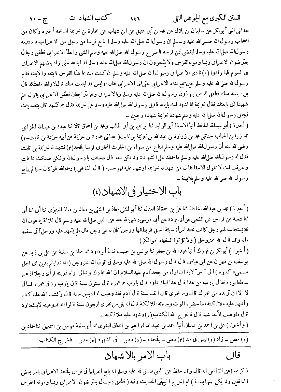قال باب الامر بالاشهاد ذكر فيه (عن الشافعي انه قال وقد حفظ عن النبي صلى الله عليه وسلم انه بايع اعرابيا في فرس فجحد الاعرابي بامر بعض المنافقين ولم يكن بينهما بينة) ثم اخرج البيهقى الحديث وفيه (فطفق رجال يعترضون الاعرابي ويساومونه الفرس
