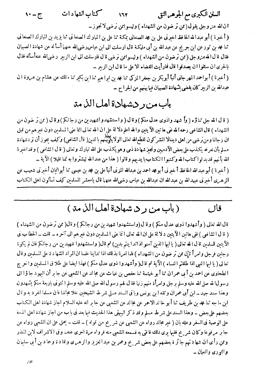 (قال الشافعي) ففى هاتين الآيتين دلالة على ان الله تعالى انما عنى المسلمين دون غيرهم إلى آخره - قلت - الخطاب في الآيتين للمسلمين قال الله تعالى (يا ايها الذين آمنو إذا تداينتم بدين) ثم قال (واستشهدوا شهيدين من رجالكم فان لم يكونا رجلين فرجل وامرأتان ممن ترضون من الشهداء) فلما امرنا بذلك إذا تداينا علمنا ان المراد الشهادة على المسلمين وقال تعالى (يا ايها النبي إذا طلقتم النساء) الآية ثم قال (وأشهدوا ذوى عدل منكم) فهذا ايضا على طلاق المسلمين واخرج الطحاوي عن احمد بن أبى عمران ثنا أبو خيثمة ثنا حفص بن غياث عن مجالد عن الشعبى عن جابر أن اليهود جاؤا إلى رسول الله صلى الله عليه وسلم برجل وامرأة منهم زنيا فقال لهم رسول الله صلى الله عليه وسلم ائتونى باربعة منكم يشهدون وهذا سند جيد - ابن أبى عمران وثقه ابن يونس وباقى السند على شرط الشيخين خلا مجالدا فان مسلما انفرد به وقال ابن ماجه ثنا محمد بن طريف ثنا أبو خالد الاحمر عن مجالد عن الشعبى عن جابر انه عليه السلام اجاز شهادة اهل الكتاب بعضهم على بعض - وهذا السند على شرط مسلم وقد ذكر البيهقى هذا الحديث فيما بعد في باب من اجاز شهادة اهل الذمة على الوصية في السفر وعلله بان (غير مجالد رواه عن الشعبى عن شريح من قوله) - قلت - يحمل على ان الشعبى رواه عن جابر مرفوعا وكان شريح فقيها يرى ذلك فافتى به فسمعه الشعبى منه فرواه مرة اخرى عنه - وفى الاشراف لابن المنذر وممن رأى ان شهادتهم جائزة بعضهم على بعض شريح وعمر بن عبد العزيز والزهرى وقتادة وحماد بن أبى سليمان والثوري والنعمان -