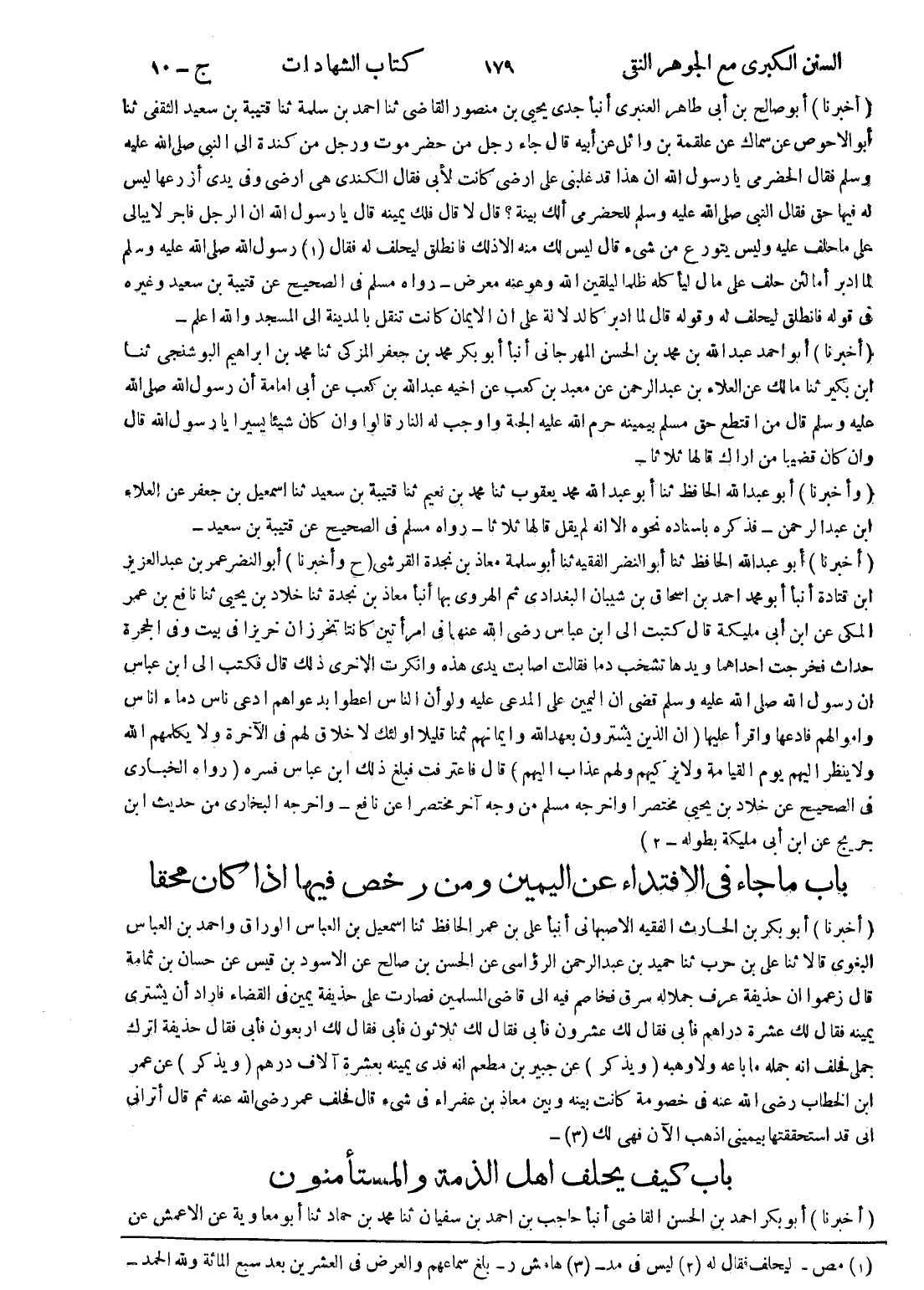 ابن قتادة انبأ أبو محمد احمد بن اسحاق بن شيبان البغدادي ثم الهروي بها انبأ معاذ بن نجدة ثنا خلاد بن يحيى ثنا نافع بن عمر المكى عن ابن أبى مليكة قال كتبت إلى ابن عباس رضى الله عنهما في امرأتين كانتا تخرزان خريزا في بيت وفي الحجرة حداث فخرجت احداهما ويدها تشخب دما فقالت اصابت يدى هذه وانكرت الاخرى ذلك قال فكتب إلى ابن عباس ان رسول الله صلى الله عليه وسلم قضى ان اليمين على المدعى عليه ولو أن الناس اعطوا بدعواهم ادعى ناس دماء اناس واموالهم فادعها واقرأ عليها (ان الذين يشترون بعهد الله وايمانهم ثمنا قليلا اولئك لا خلاق لهم في الآخرة ولا يكلمهم الله ولا ينظر إليهم يوم القيامة ولا يزكيهم ولهم عذاب إليهم) قال فاعترفت فبلغ ذلك ابن عباس فسره (رواه البخاري في الصحيح عن خلاد بن يحيى مختصرا واخرجه مسلم من وجه آخر مختصرا عن نافع - واخرجه البخاري من حديث ابن جريج عن ابن أبى مليكة بطوله - 2) باب ما جاء في الافتداء عن اليمين ومن رخص فيها إذا كان محقا