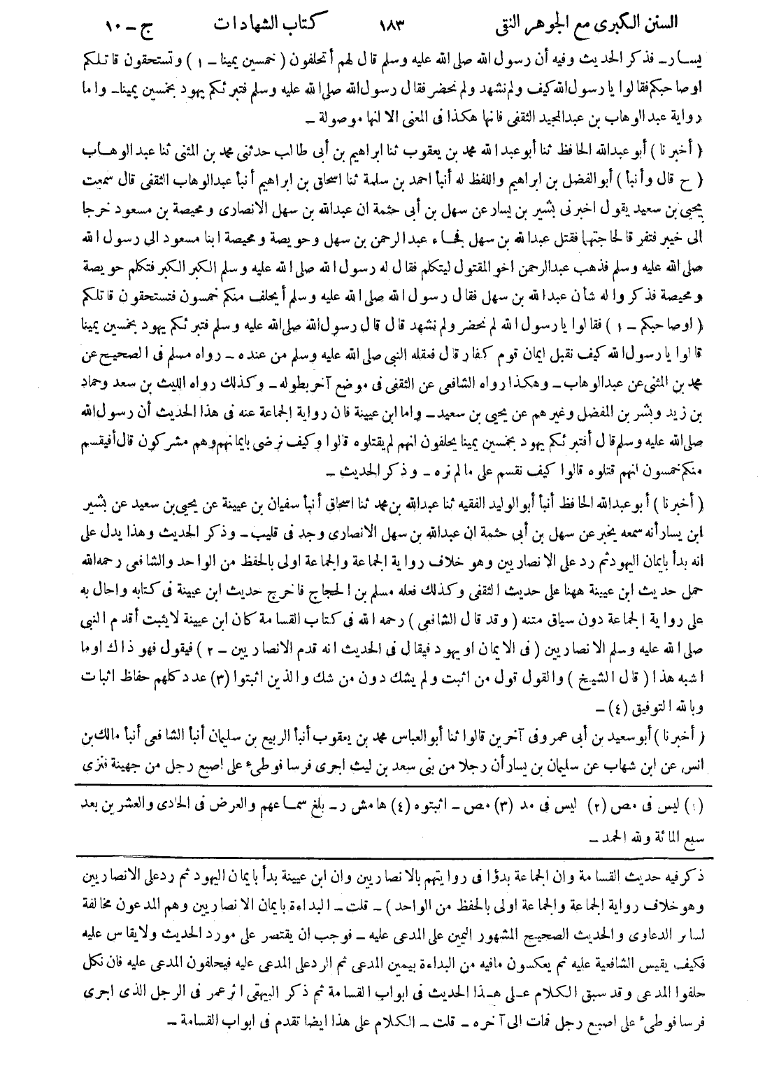 ذكر فيه حديث القسامة وان الجماعة بدؤا في روايتهم بالانصاريين وان ابن عيينة بدأ بايمان اليهود ثم رد على الانصاريين وهو خلاف رواية الجماعة والجماعة اولى بالحفظ من الواحد) - قلت - البداءة بايمان الانصاريين وهم المدعون مخالفة لسائر الدعاوى والحديث الصحيح المشهور اليمين على المدعى عليه - فوجب ان يقتصر على مورد الحديث ولا يقاس عليه فكيف يقيس الشافعية عليه ثم يعكسون ما فيه من البداءة بيمين المدعى ثم الرد على المدعى عليه فيحلفون المدعى عليه فان نكل حلفوا المدعى وقد سبق الكلام على هذا الحديث في ابواب القسامة ثم ذكر البيهقى اثر عمر في الرجل الذى اجرى فرسا فوطئ على اصبع رجل فمات إلى آخره - قلت - الكلام على هذا ايضا تقدم في ابواب القسامة -