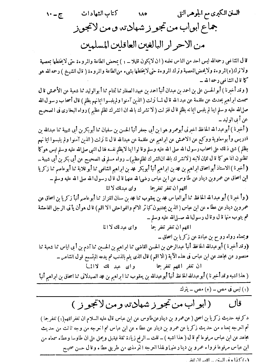 قال (ابواب من تجوز شهادته ومن لا تجوز) ذكر فيه حديث زكريا بن اسحق (عن عمرو بن دينار عن طاوس عن ابن عباس قال عليه السلام ان تغفر اللهم (1) تغفر جما) ثم اخرجه بمعناه من حديث زكريا عن عمرو بن دينار عن عطاء عن ابن عباس ثم اخرجه من وجه ثالث من حديث مجاهد عن ابن عباس مرفوعا ثم قال (هذا اشبه) - قلت - الرفع زيادة ثقة فيقبل ويحمل على ان طاوسا وعطاء سمعاه من ابن عباس مرفوعا فرواه عمرو بن دينار عنهما ولهذا اخرجه الترمذي من طريق عطاء وقال حسن صحيح