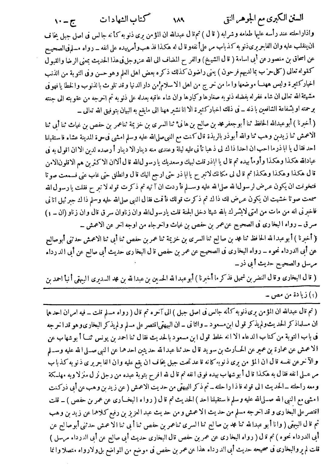 والآخر عن نفسه قال ان المؤمن يرى ذنوبه كانه قاعد تحت جبل يخاف ان يقع عليه وان الفاجر يرى ذنوبه كذباب مر على انفه فقال به هكذا قال أبو شهاب بيده فوق انفه ثم قال لله افرح بتوبة عبده من رجل نزل منزلا وبه مهلكة ومعه راحلته - الحديث إلى قوله فإذا راحلته - ثم ذكر البيهقى من حديث الاعمش (عن زيد بن وهب عن أبى ذر كنت امشى مع النبي الله صلى الله عليه وسلم فاستقبلنا احد) الحديث ثم قال (رواه البخاري عن عمر بن حفص) - قلت اقتصر على البخاري وقد اخرجه مسلم من حديث الاعمش ومن حديث عبد العزيز بن رفيع كلاهما عن زيد بن وهب ثم قال البيهقى (وانا أبو عبد الله ثنا محمد بن صالح ثنا السرى ثنا عمر بن حفص ثنا أبى ثنا الاعمش حدثنى أبو صالح عن أبى الدرداء نحوه) ثم قال (رواه البخاري عن عمر بن حفص قال البخاري حديث أبى صالح عن أبى الدرداء مرسل) قلت لم يرو البخاري في صحيحه حديث أبى الدرداء هذا عن عمر بن حفص في موضع من المواضع بل ولا رواه متصلا وانما