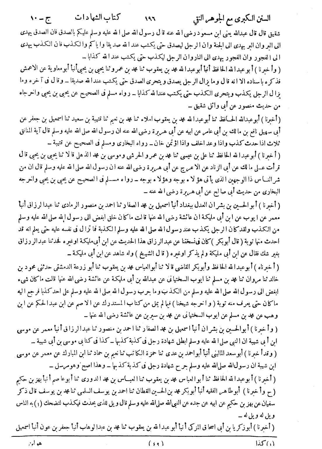 شقيق قال قال عبد الله يعنى ابن مسعود رضى الله عنه قال رسول الله صلى الله عليه وسلم عليكم بالصدق فان الصدق يهدى إلى البر وان البر يهدى إلى الجنة وان الرجل ليصدق حتى يكتب عند الله صديقا واياكم والكذب فان الكذب يهدى إلى الفجور وان الفجور يهدى إلى النار وان الرجل ليكذب حتى يكتب عند الله كذابا (وأخبرنا) أبو عبد الله الحافظ أنبأ أبو عبد الله محمد بن يعقوب ثنا محمد بن عمرو ثنا يحيى بن يحيى أنبأ أبو معاوية عن الاعمش فذكره باسناده الا انه قال وما يزال الرجل يصدق ويتحرى الصدق حتى يكتب عند الله صديقا - وقال في آخره وما يزال الرجل يكذب ويتحرى الكذب حتى يكتب عند الله كذابا - رواه مسلم في الصحيح عن يحيى بن يحيى واخرجاه من حديث منصور عن أبى وائل شقيق