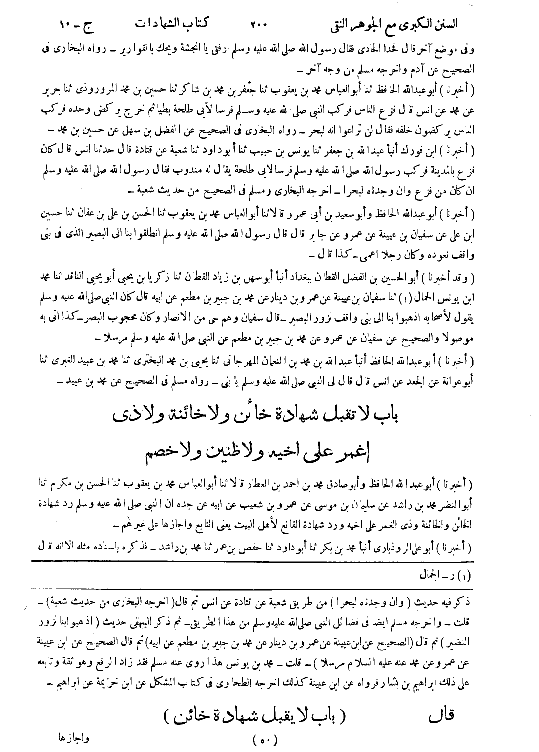 ذكر فيه حديث (وان وجدناه لبحرا) من طريق شعبة عن قتادة عن انس ثم قال (اخرجه البخاري من حديث شعبة) - قلت - واخرجه مسلم ايضا في فضائل النبي صلى الله عليه وسلم من هذا الطريق - ثم ذكر البيهقى حديث (اذهبوا بنا نزور النضير) ثم قال (الصحيح عن ابن عيينة عن عمرو بن دينار عن محمد بن جبير بن مطعم عن ابيه) ثم قال الصحيح عن ابن عيينة عن عمرو عن محمد عنه عليه السلام مرسلا) - قلت - محد بن يونس هذا روى عنه مسلم فقد زاد الرفع وهو ثقة وتابعه على ذلك ابراهيم بن بشار فرواه عن ابن عيينة كذلك اخرجه الطحاوي في كتاب المشكل عن ابن خزيمة عن ابراهيم - قال (باب لا يقبل شهادة خائن)
