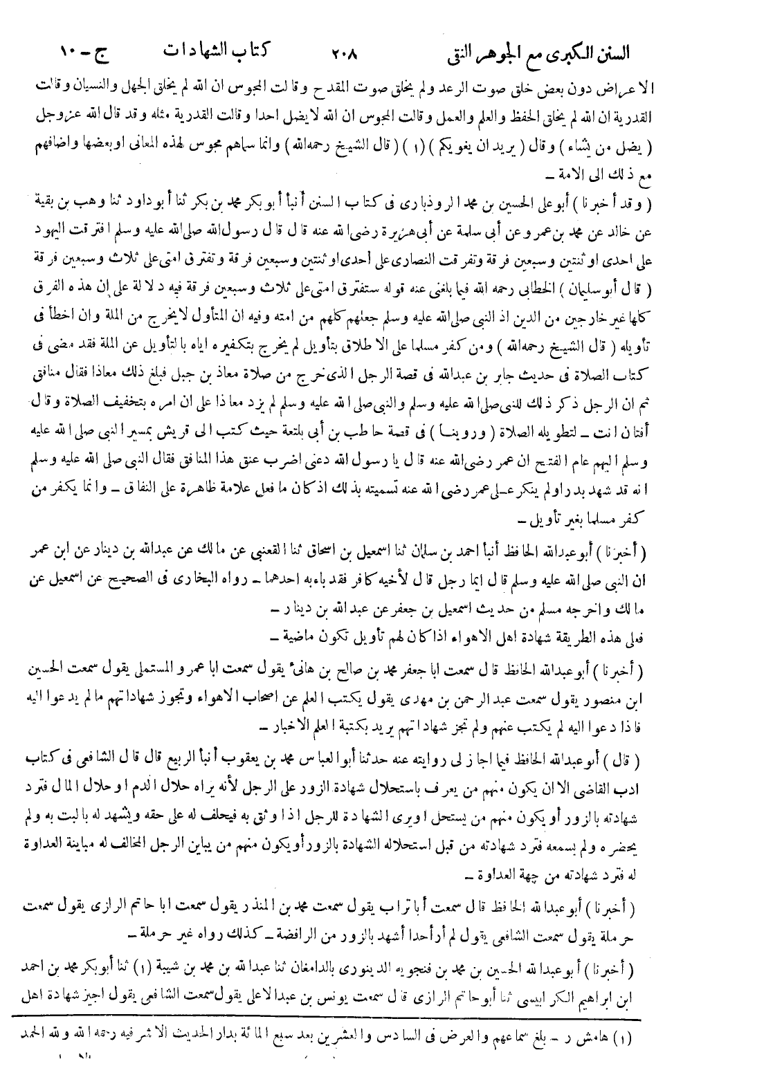(أخبرنا) أبو عبد الله الحافظ أنبأ احمد بن سلمان ثنا اسمعيل بن اسحاق ثنا القعنبى عن مالك عن عبد الله بن دينار عن ابن عمر ان النبي صلى الله عليه وسلم قال ايما رجل قال لاخيه كافر فقد باء به احدهما - رواه البخاري في الصحيح عن اسمعيل عن مالك واخرجه مسلم من حديث اسمعيل بن جعفر عن عبد الله بن دينار فعلى هذه الطريقة شهادة اهل الاهواء إذا كان لهم تأويل تكون ماضية