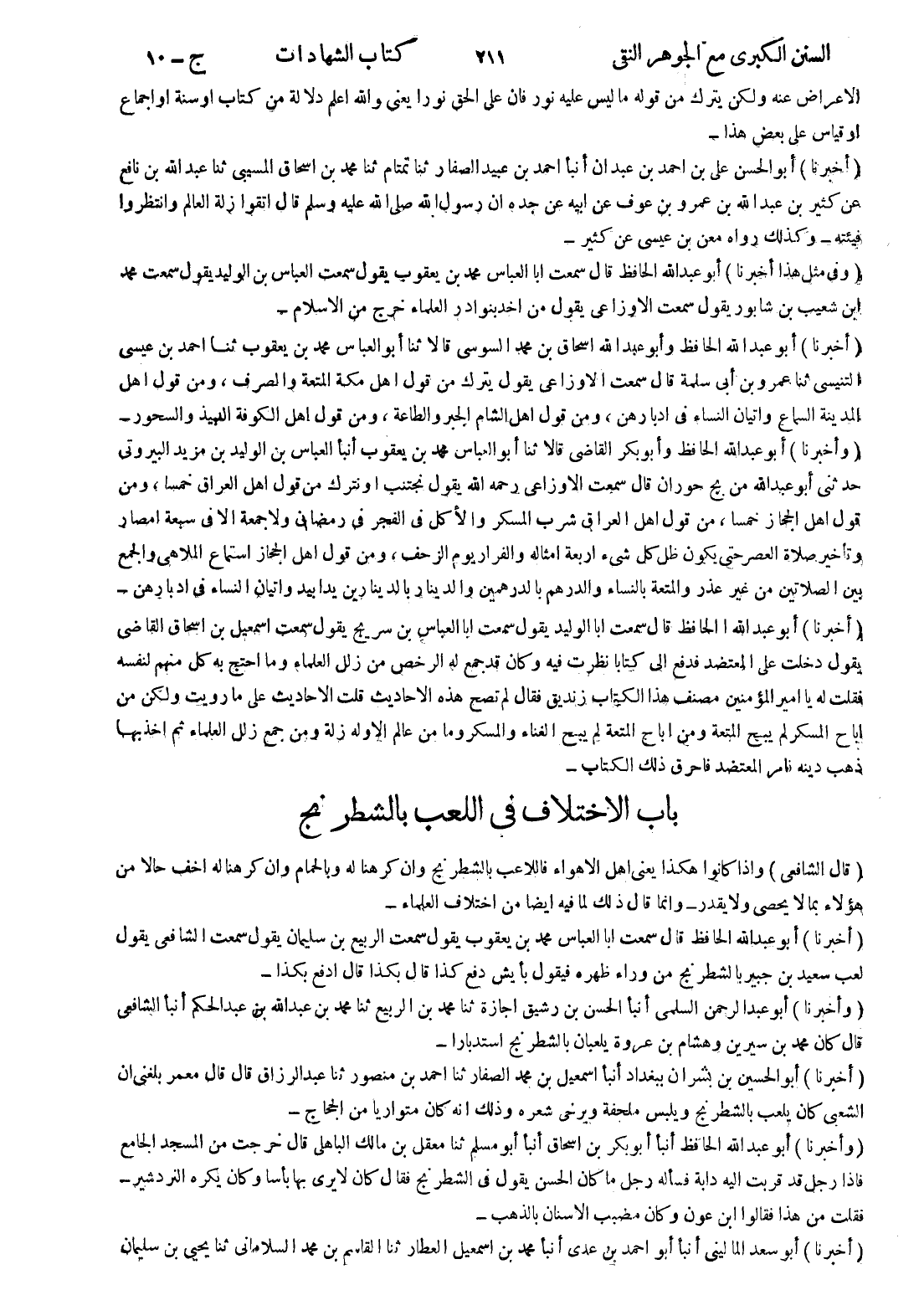 (أخبرنا) أبو الحسين بن بشران ببغداد أنبأ اسمعيل بن محمد الصفار ثنا احمد بن منصور ثنا عبد الرزاق قال قال معمر بلغني ان الشعبى كان يلعب بالشطرنج ويلبس ملحفة ويرخى شعره وذلك انه كان متواريا من الحجاج (و أخبرنا) أبو عبد الله الحافظ أنبأ أبو بكر بن اسحاق أنبأ أبو مسلم ثنا معقل بن مالك الباهلى قال خرجت من المسجد الجامع فإذا رجل قد قربت إليه دابة فسأله رجل ما كان الحسن يقول في الشطرنج فقال كان لا يرى بها بأسا وكان يكره النرد شير فقلت من هذا فقالوا ابن عون وكان مضبب الاسنان بالذهب