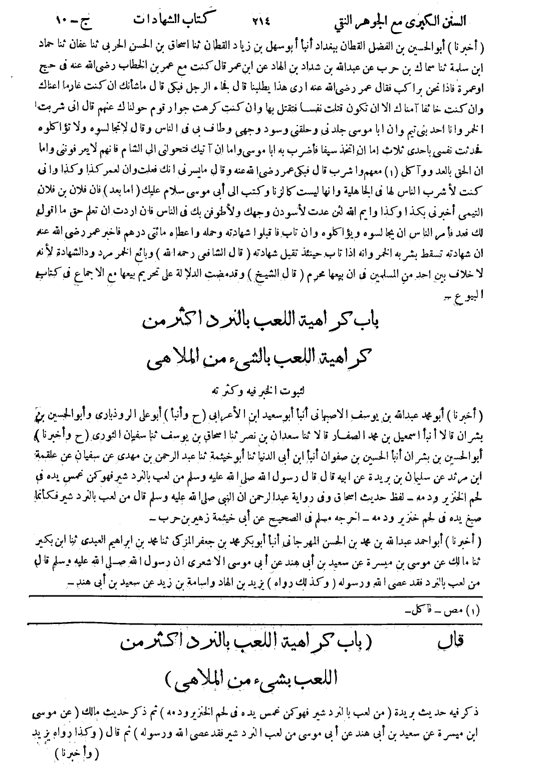 قال (باب كراهية اللعب بالنرد اكثر من اللعب بشئ من الملاهي) ذكر فيه حديث بريدة من لعب بالنرد شير فهو كمن غمس يده في لحم الخنزير ودمه) ثم ذكر حديث مالك (عن موسى ابن ميسرة عن سعيد بن أبى هند عن أبى موسى من لعب النرد شير فقد عصى الله ورسوله) ثم قال (وكذا رواه يزيد