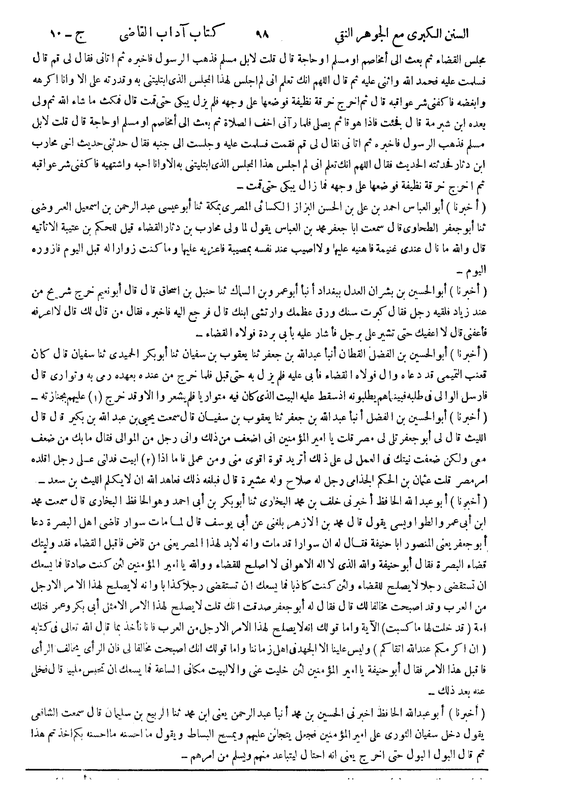 مجلس القضاء ثم بعث إلى أمخاصم أو مسلم أو حاجة قال قلت لابل مسلم فذهب الرسول فاخبره ثم اتانى فقال لى قم قال فسلمت عليه فحمد الله واثنى عليه ثم قال اللهم انك تعلم انى لم اجلس لهذا المجلس الذى ابتليتنى به وقدرته على الا وانا اكرهه وابغضه فاكفني شر عواقبه قال ثم اخرج خرقة نظيفة فوضعها على وجهه فلم يزل يبكى حتى قمت قال فمكث ما شاء الله ثم ولى بعده ابن شبرمة قال فجئت فإذا هو قائم يصلى فلما رأني اخف الصلاة ثم بعث إلى أمخاصم أو مسلم أو حاجة قال قلت لابل مسلم فذهب الرسول فاخبره ثم اتانى فقال لى قم فقمت فسلمت عليه وجلست إلى جنبه فقال حدثنى حديث اخى محارب ابن دثار فحدثته الحديث فقال اللهم انك تعلم انى لم اجلس هذا المجلس الذى ابتليتنى به الا وانا احبه واشتهيه فاكفني شرعواقبه ثم اخرج خرقة نظيفة فوضعها على وجهه فما زال يبكى حتى قمت