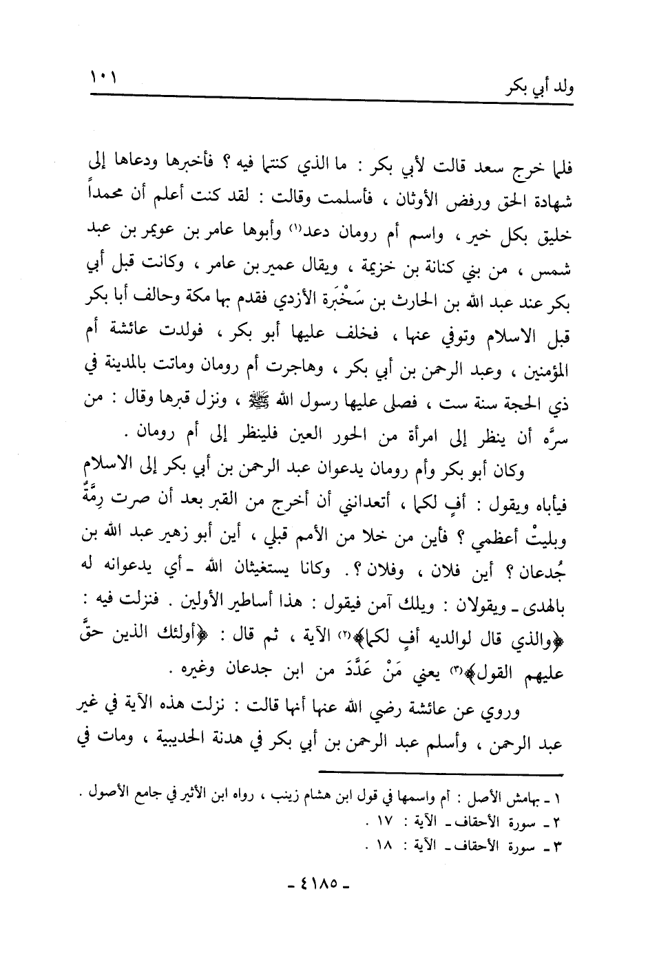 وَكَانَ أَبُو بَكْرٍ وأم رومان يدعوان عَبْد الرَّحْمَنِ بْن أَبِي بَكْر إِلَى الإِسْلام فيأباه ويقول: أف لكما، أتعدانني أن أخرج من القبر بعد أن صرت رمة وبليت أعظمي؟ فأين من خلا من الأمم قبلي، أين أَبُو زهير عَبْد اللَّهِ بْن جدعان؟ أين فلان، وفلان؟. وكانا يستغيثان اللَّه- أي يدعوانه لَهُ بالهدى- ويقولان: ويلك آمن فيقول: هَذَا أساطير الأولين. فنزلت فيه:
