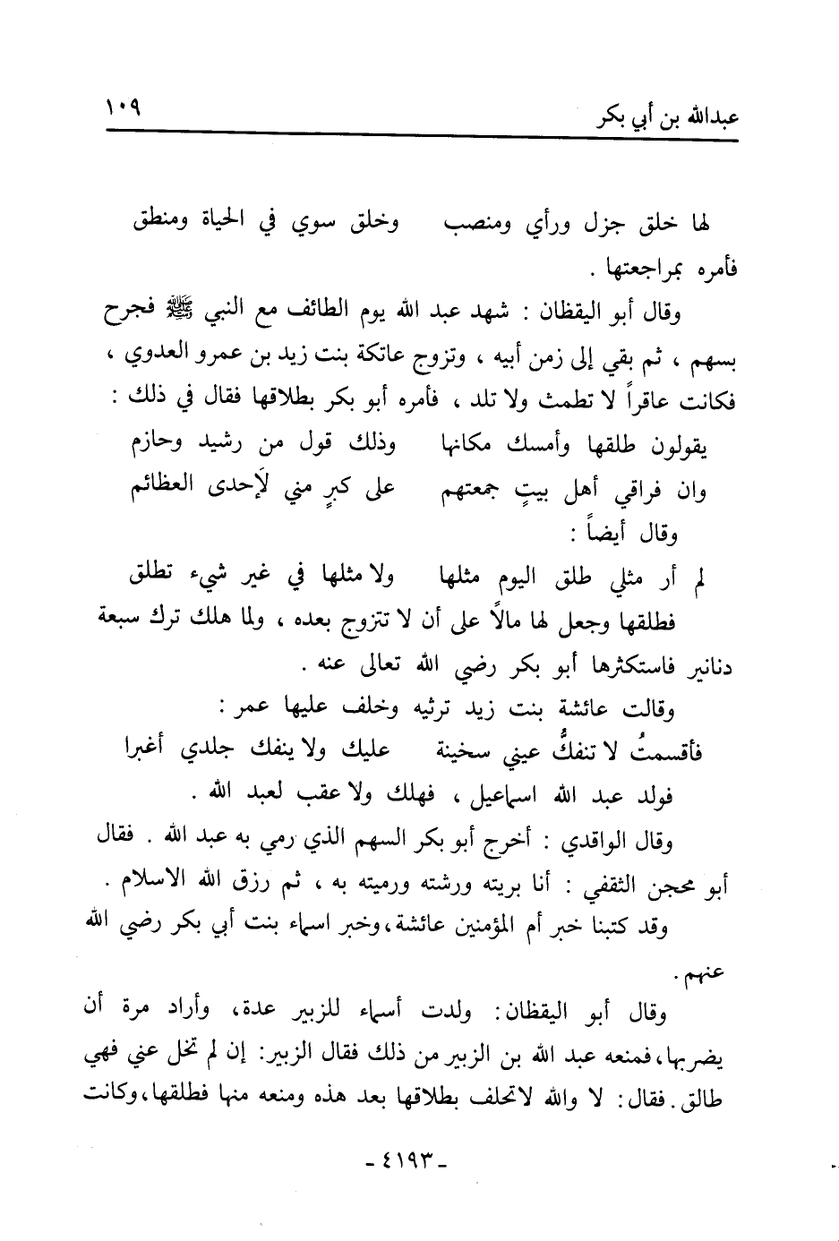 وَقَالَ أَبُو اليقظان: شهد عَبْد اللَّهِ يَوْم الطائف مَعَ النَّبِيّ صَلَّى اللَّهُ عَلَيْهِ وَسَلَّمَ فجرح بسهم، ثُمَّ بقي إِلَى زمن أَبِيهِ، وتزوج عاتكة بِنْت زَيْد بْن عَمْرو العدوي، فكانت عاقرا لا تطمث وَلا تلد، فأمره أَبُو بَكْر بطلاقها فَقَالَ فِي ذَلِكَ: