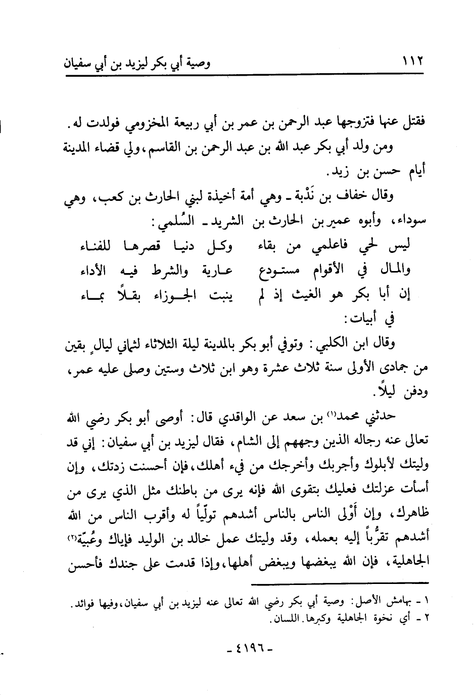 حَدَّثَنِي مُحَمَّد [1] بْن سَعْد عَنِ الواقدي قَالَ: أوصى أبو بكر رضي الله تعالى عَنْهُ رجاله الذين وجههم إِلَى الشام، فَقَالَ ليزيد بْن أَبِي سُفْيَان: إني قد وليتك لأبلوك وأجربك وأخرجك من فيء أهلك، فإن أحسنت زدتك، وإن أسأت عزلتك فعليك بتقوى اللَّه فإنه يرى من باطنك مثل الَّذِي يرى من ظاهرك، وإن أولى النَّاس بِالنَّاسِ أشدهم توليا لَهُ وأقرب النَّاس من اللَّه أشدهم تقرّبا إليه بعمله، وقد وليتك عمل خَالِد بْن الْوَليِد فإياك وعبية [2] الجاهلية، فإن اللَّه يبغضها ويبغض أهلها، وإذا قدمت على جندك فأحسن