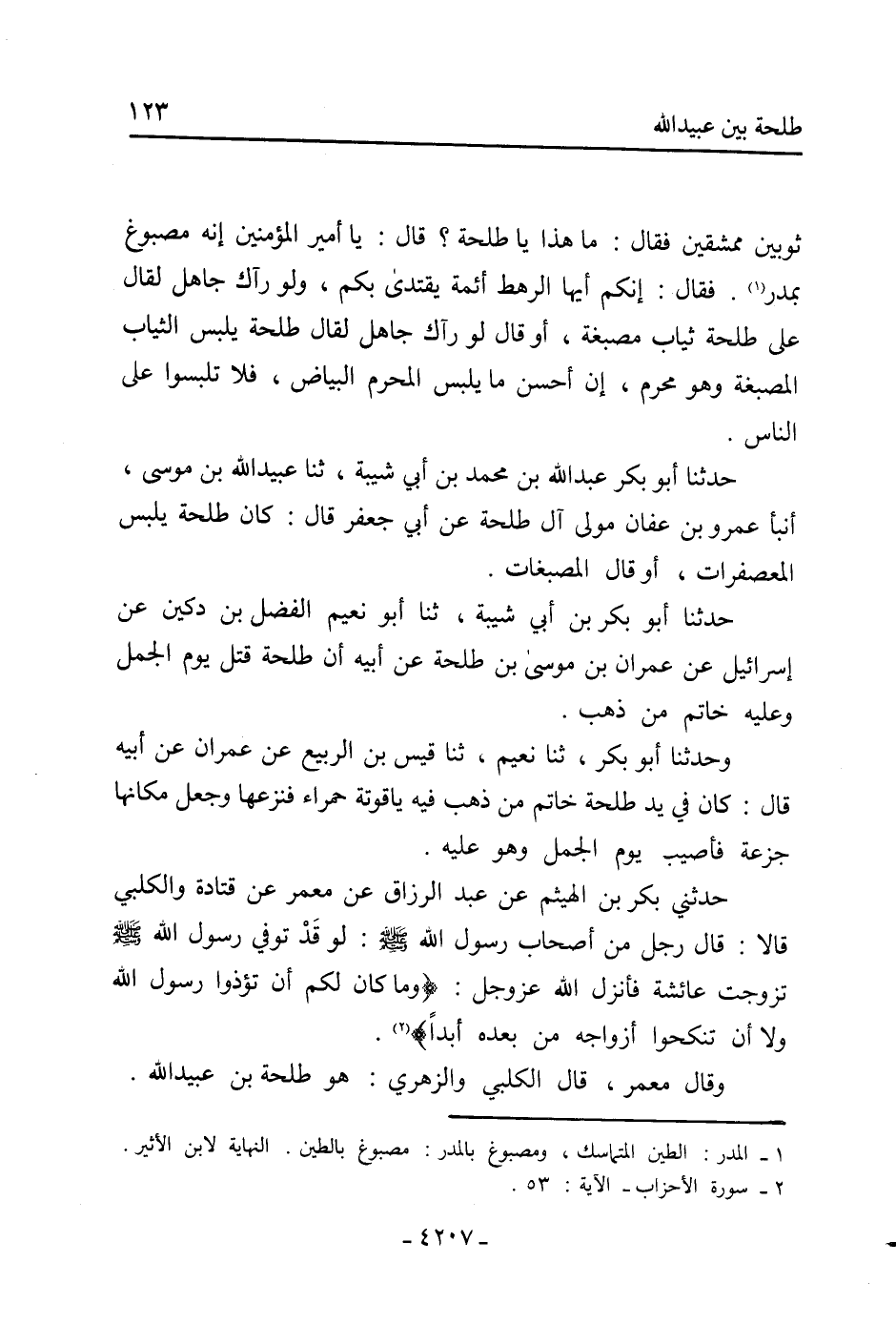 حَدَّثَنَا أَبُو بَكْرٍ عَبْدُ اللَّهِ بْنُ مُحَمَّدِ بْنِ أَبِي شَيْبَةَ، ثنا عُبَيْدُ اللَّهِ بْنُ مُوسَى، أنبأ عَمْرُو بْنُ عَفَّانَ مَوْلَى آلِ طَلْحَةَ عَنْ أَبِي جَعْفَرٍ قَالَ: كَانَ طَلْحَةُ يَلْبَسُ الْمُعَصْفَرَاتِ، أَوْ قَالَ الْمُصَبَّغَاتِ.