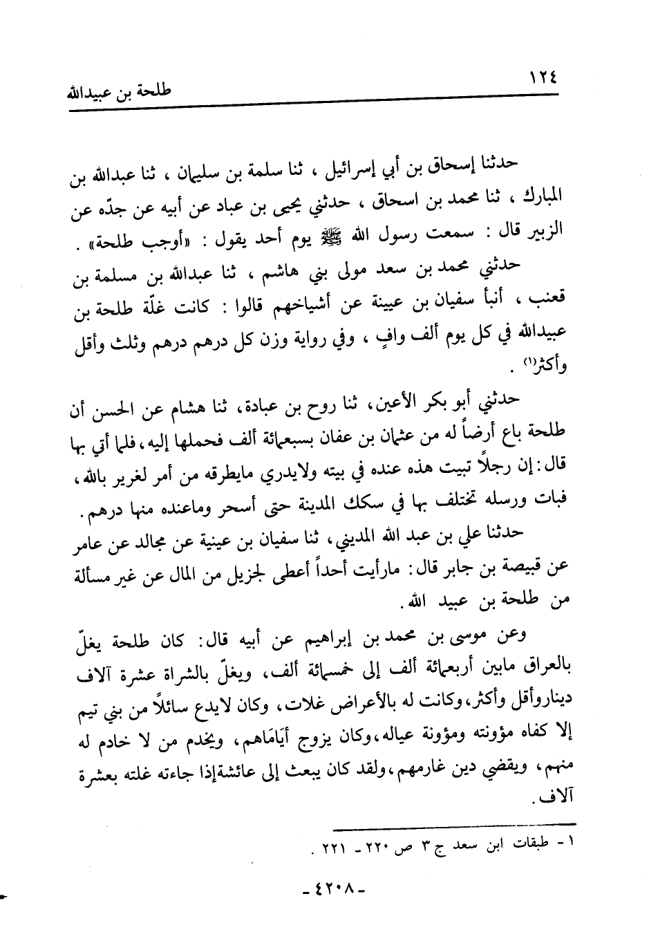 حَدَّثَنِي مُحَمَّد بْن سَعْد مولى بَنِي هاشم، ثنا عَبْد اللَّهِ بْن مسلمة بْن قعنب، أنبأ سُفْيَان بْن عُيَيْنَةَ عَن أشياخهم قَالُوا: كَانَتْ غلّة طلحة بن عبيد اللَّهِ فِي كُلّ يَوْم ألف واف، وفي رواية وزن كل درهم درهم وثلث وأقل وأكثر [1] .