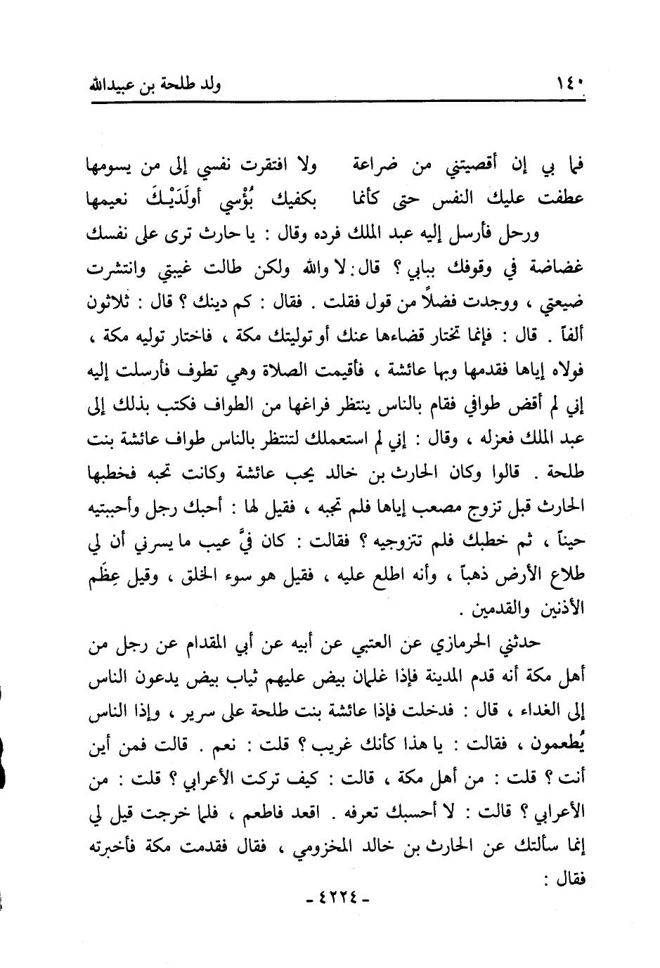 ورحل فأرسل إِلَيْهِ عَبْد الْمَلِكِ فرده وَقَالَ: يَا حارث ترى عَلَى نفسك غضاضة فِي وقوفك ببابي؟ قَالَ: لا وَاللَّه ولكن طالت غيبتي وانتشرت ضيعتي، ووجدت فضلا من قول فقلت. فَقَالَ: كم دينك؟ قَالَ: ثلاثون ألفا. قَالَ: فإنما تختار قضاءها عنك أَوْ توليتك مَكَّة، فاختار توليه مَكَّة، فولاه إياها فقدمها وبها عَائِشَة، فأقيمت الصلاة وَهِيَ تطوف فأرسلت إِلَيْهِ إني لم أقض طوافي فقام بِالنَّاسِ ينتظر فراغها من الطواف فكتب بِذَلِكَ إِلَى عَبْد الْمَلِكِ فعزله، وَقَالَ: إني لم استعملك لتنتظر بِالنَّاسِ طواف عَائِشَة بِنْت طَلْحَة. قَالُوا وَكَانَ الْحَارِث بْن خَالِد يحب عَائِشَة وكانت تحبه فخطبها الْحَارِث قبل تزوج مصعب إياها فلم تجبه، فقيل لها: أحبك رجل وأحببتيه حينا، ثُمَّ خطبك فلم تتزوجيه؟ فَقَالَتْ: كَانَ في عيب ما يسرني أن لي طلاع الأرض ذهبا، وأنه اطلع عَلَيْهِ، فقيل هُوَ سوء الخلق، وقيل عظم الأذنين والقدمين.