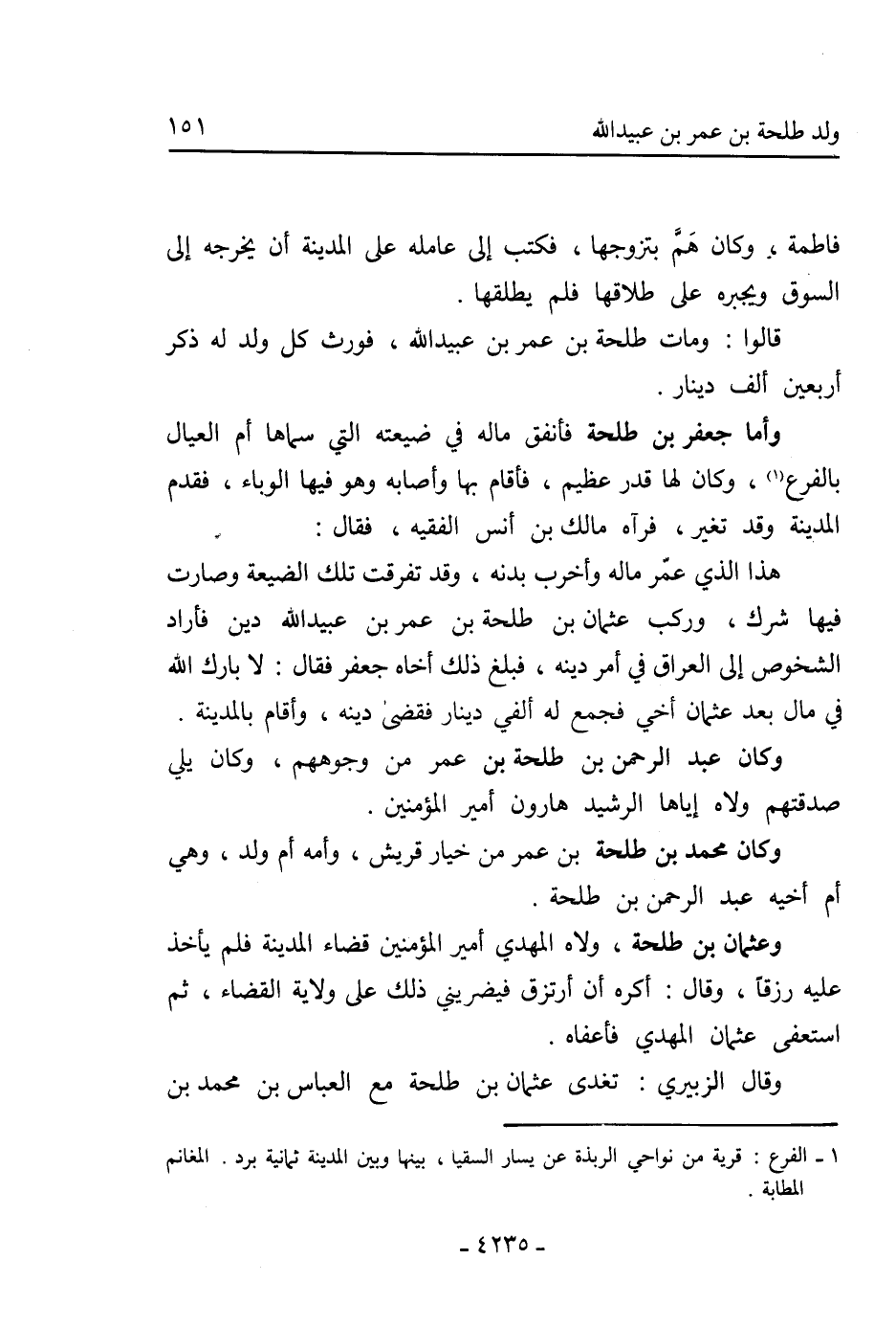 هَذَا الَّذِي عمر ماله وأخرب بدنه، وقد تفرقت تلك الضيعة وصارت فِيهَا شرك، وركب عُثْمَان بْن طَلْحَة بْن عُمَرَ بْن عُبَيْد اللَّه دين فأراد الشخوص إِلَى العراق فِي أمر دينه، فبلغ ذَلِكَ أخاه جَعْفَر فَقَالَ: لا بارك اللَّه فِي مال بعد عُثْمَان أخي فجمع لَهُ ألفي دينار فقضي دينه، وأقام بالمدينة.