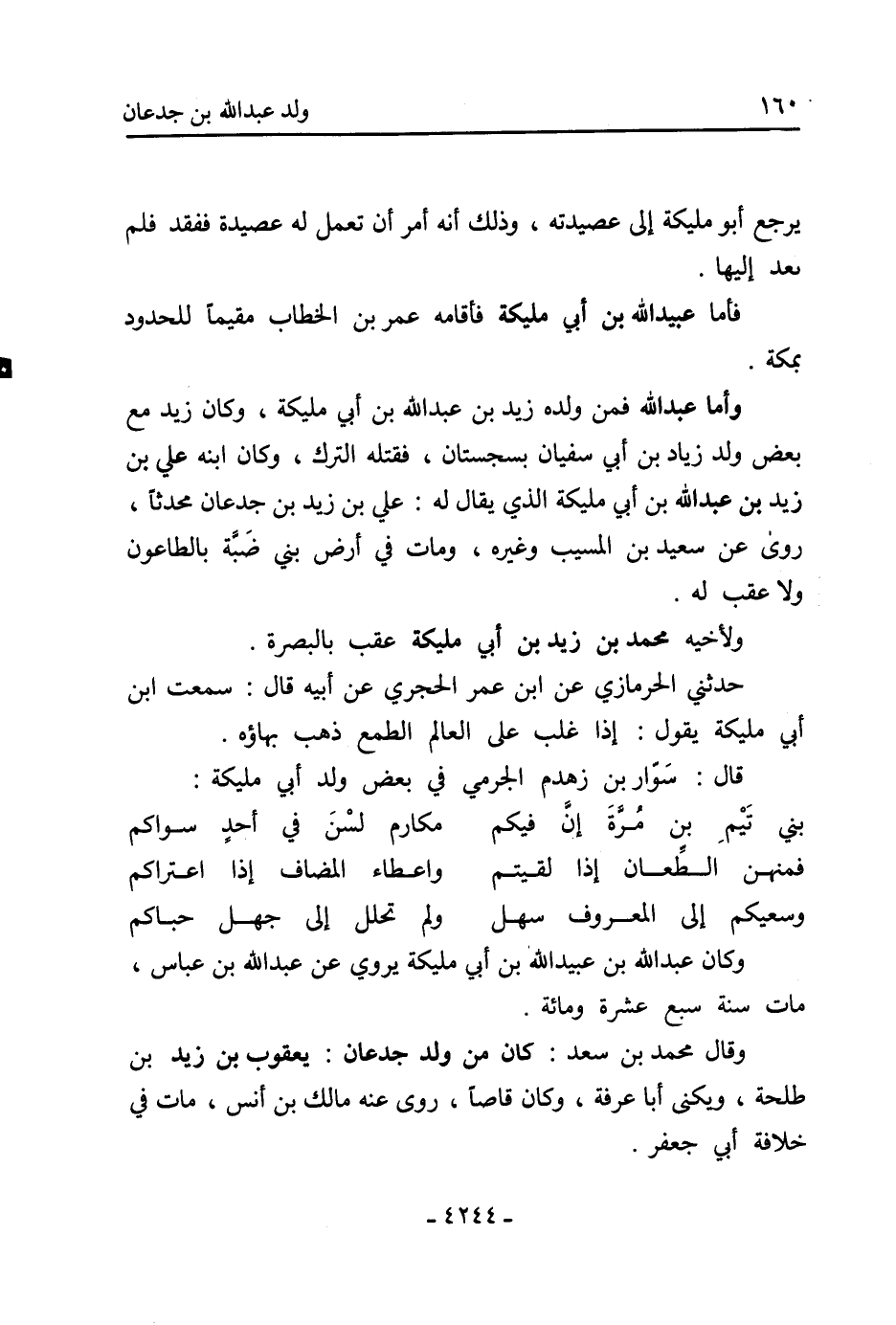 وأما عَبْد اللَّهِ فمن ولده زَيْد بْن عَبْدِ اللَّهِ بْنِ أَبِي مليكة، وَكَانَ زَيْد مَعَ بعض ولد زياد بْن أَبِي سُفْيَان بسجستان، فقتله الترك، وَكَانَ ابنه عَلِيّ بْن زيد بْن عَبْد اللَّهِ بْن أَبِي مليكة الَّذِي يقال لَهُ: عَلِيّ بْن زَيْد بْن جدعان محدثا، روى عَن سَعِيد بْن الْمُسَيِّبِ وغيره، ومات فِي أرض بني ضبة بالطاعون وَلا عقب لَهُ.