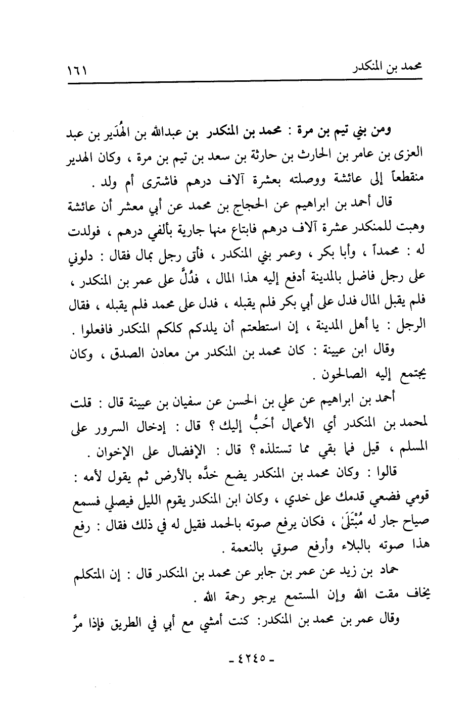 أَحْمَد بْن إِبْرَاهِيمَ عَن عَلِيّ بْن الْحَسَن عَن سُفْيَان بْن عُيَيْنَةَ قَالَ: قلت لمحمد بْن المنكدر أي الأعمال أحب إِلَيْك؟ قَالَ: إدخال السرور عَلَى المسلم، قيل فما بقي مما تستلذه؟ قَالَ: الإفضال عَلَى الإخوان.