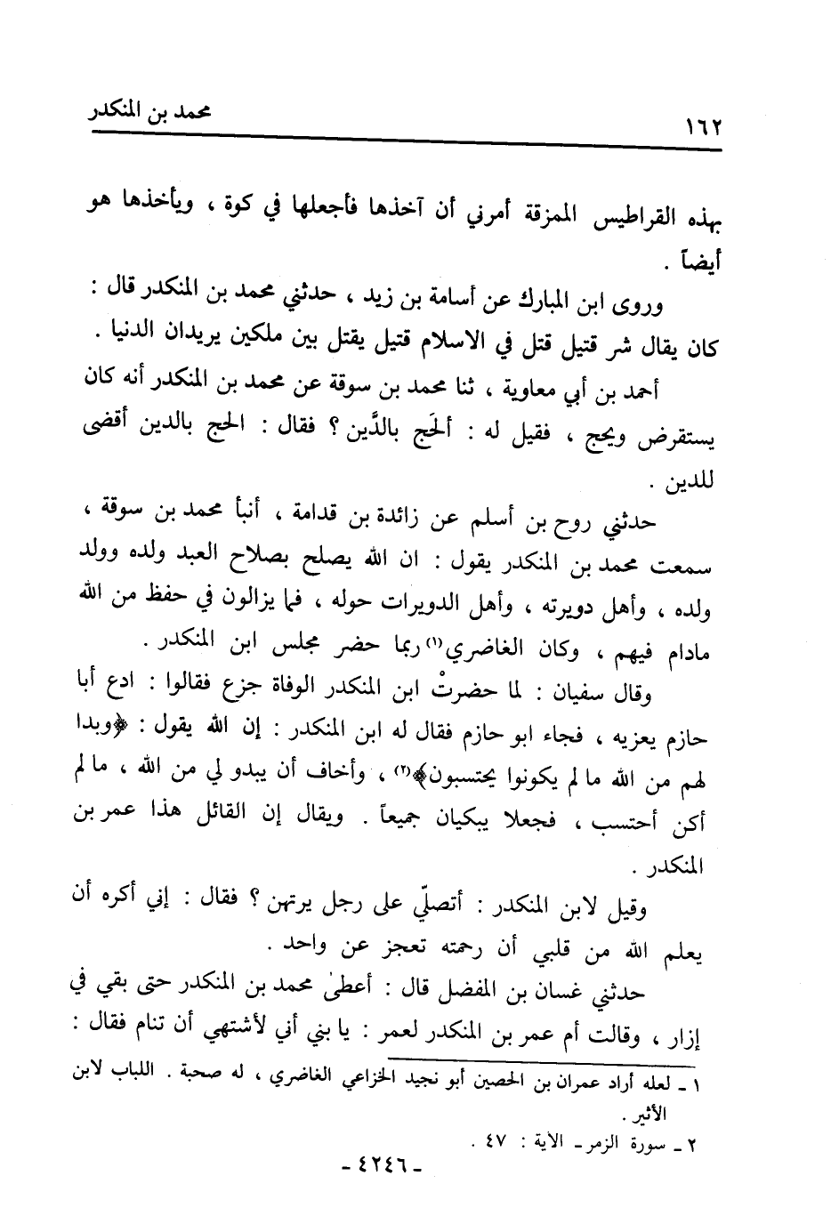 أَحْمَد بْن أَبِي مُعَاوِيَة، ثنا مُحَمَّد بْن سَوْقَةَ عَن مُحَمَّد بْن الْمُنْكَدِرِ أنه كَانَ يستقرض ويحج، فقيل لَهُ: آلحج بالدين؟ فَقَالَ: الحج بالدين أقضى للدين.