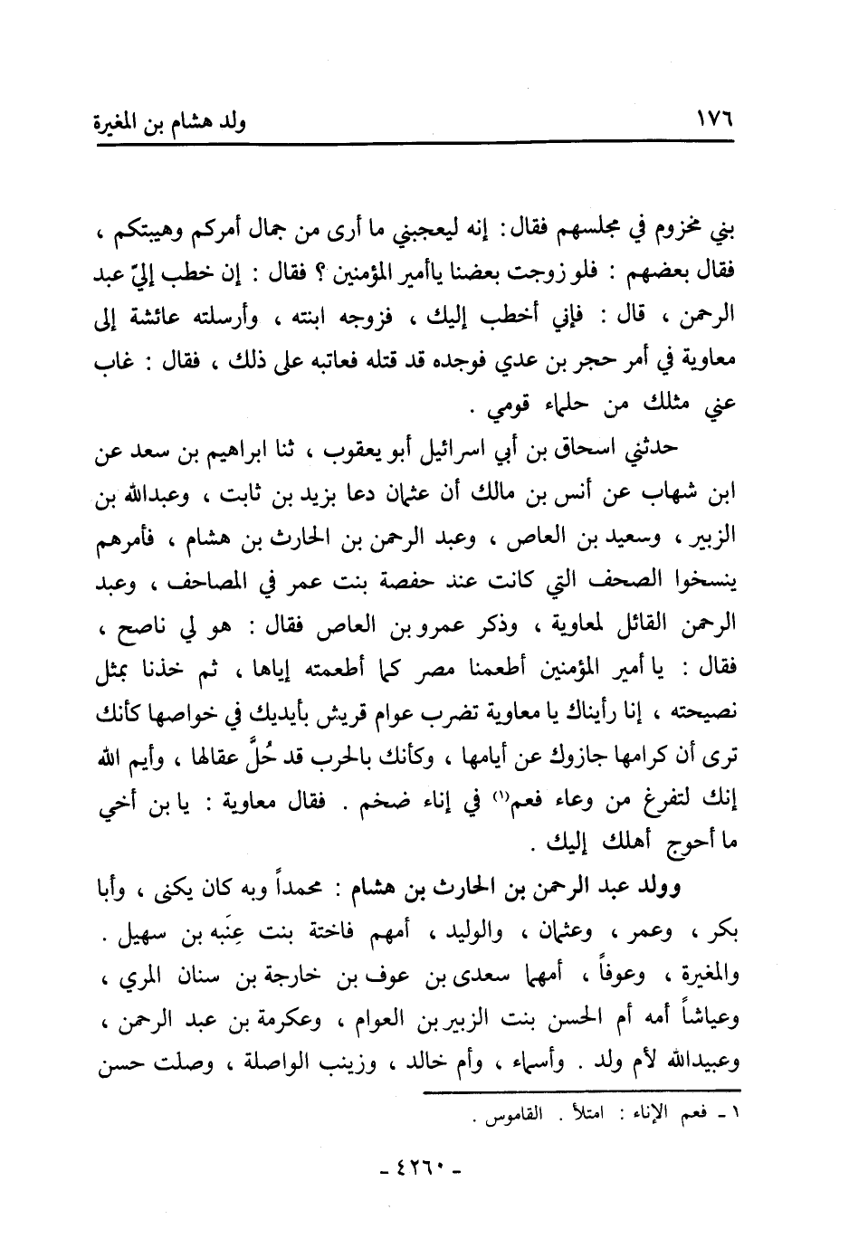 حَدَّثَنِي إِسْحَاقُ بْنُ أَبِي إِسْرَائِيلَ أَبُو يَعْقُوبَ، ثنا إِبْرَاهِيمُ بْنُ سَعْدٍ عَنِ ابْنِ شِهَابٍ عَنْ أَنَسِ بْنِ مَالِكٍ أَنَّ عُثْمَانَ دَعَا بِزَيْدِ بْنِ ثَابِتٍ، وَعَبْدِ اللَّهِ بْنِ الزُّبَيْرِ، وَسَعِيدِ بْنِ الْعَاصِ، وَعَبْدِ الرَّحْمَنِ بْنِ الْحَارِثِ بْنِ هِشَامٍ، فَأَمَرَهُمْ يَنْسَخُوا الصُّحُفَ الَّتِي كَانَتْ عِنْدَ حَفْصَةَ بِنْتِ عُمَرَ فِي الْمَصَاحِفِ، وَعَبْدُ الرَّحْمَنِ الْقَائِلُ لِمُعَاوِيَةَ، وَذَكَرَ عَمْرَو بْنَ الْعَاصِ فَقَالَ: هُوَ لِي نَاصِحٌ، فَقَالَ: يَا أَمِيرَ الْمُؤْمِنِينَ أَطْعِمْنَا مِصْرَ كَمَا أَطْعَمْتَهُ إِيَّاهَا، ثُمَّ خُذْنَا بِمِثْلِ نَصِيحَتِهِ، إِنَّا رَأَيْنَاكَ يَا مُعَاوِيَةُ تَضْرِبُ عَوَامَّ قُرَيْشٍ بِأَيْدِيَكَ فِي خَوَاصِّهَا كَأَنَّكَ تَرَى أَنَّ كِرَامَهَا جَازَوْكَ عَنْ أَيَّامِهَا، وَكَأَنَّكَ بِالْحَرْبِ قَدْ حُلَّ عِقَالُهَا، وَايْمُ اللَّهِ إِنَّكَ لَتَفْرُغُ مِنْ وِعَاءٍ فَعُمْ [1] فِي إِنَاءٍ ضَخْمٍ. فَقَالَ مُعَاوِيَةُ: يَابْنَ أَخِي مَا أَحْوَجَ أَهْلُكَ إِلَيْكَ.