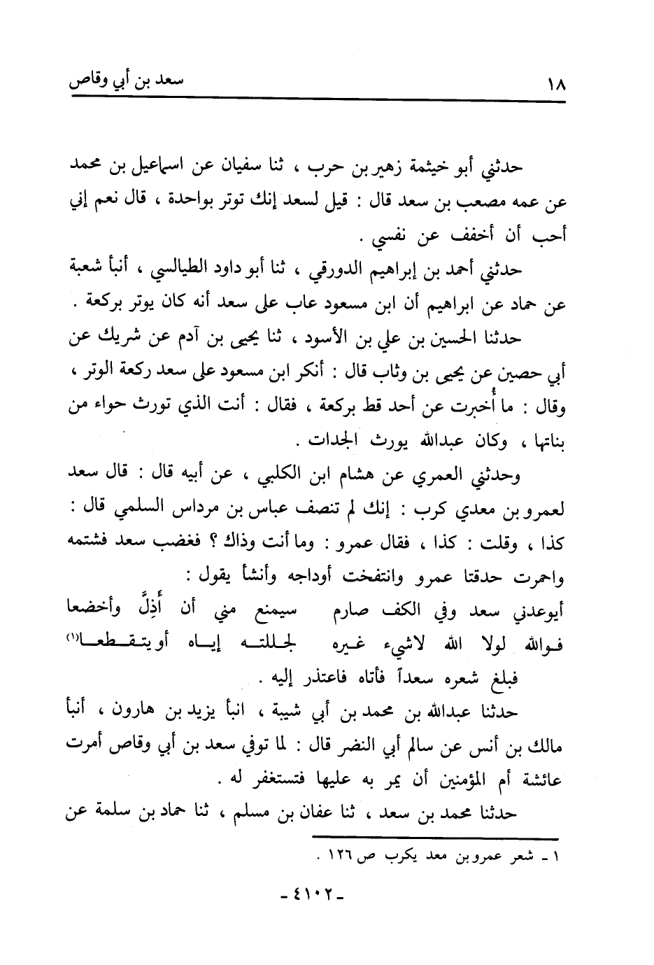 حَدَّثَنِي أَبُو خَيْثَمَةَ زُهَيْرُ بْنُ حَرْبٍ، ثنا سُفْيَانُ عَنْ إِسْمَاعِيلَ بْنِ مُحَمَّدٍ عَنْ عَمِّهِ مُصْعَبِ بْنِ سَعْدٍ قَالَ: قِيلَ لِسَعْدٍ إِنَّكَ تُوتِرُ بِوَاحِدَةٍ، قَالَ نَعَمْ إِنِّي أُحِبُّ أَنْ أُخَفِّفَ عَنْ نَفْسِي.