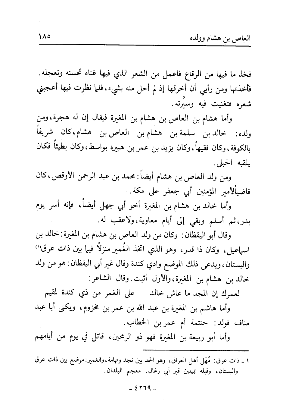 وَقَالَ أَبُو اليقظان: وَكَانَ من ولد العاص بْن هِشَام بْن الْمُغِيرَةِ: خَالِد بْن إِسْمَاعِيل، وَكَانَ ذا قدر، وَهُوَ الَّذِي اتخذ الغمير منزلا فيما بين ذات عرق [1] والبستان، ويدعى ذَلِكَ الموضع وادي كندة وَقَالَ غير أَبِي اليقظان: هُوَ من ولد خَالِد بْن هِشَام بْن الْمُغِيرَةِ، والأول أثبت. وَقَالَ الشاعر: