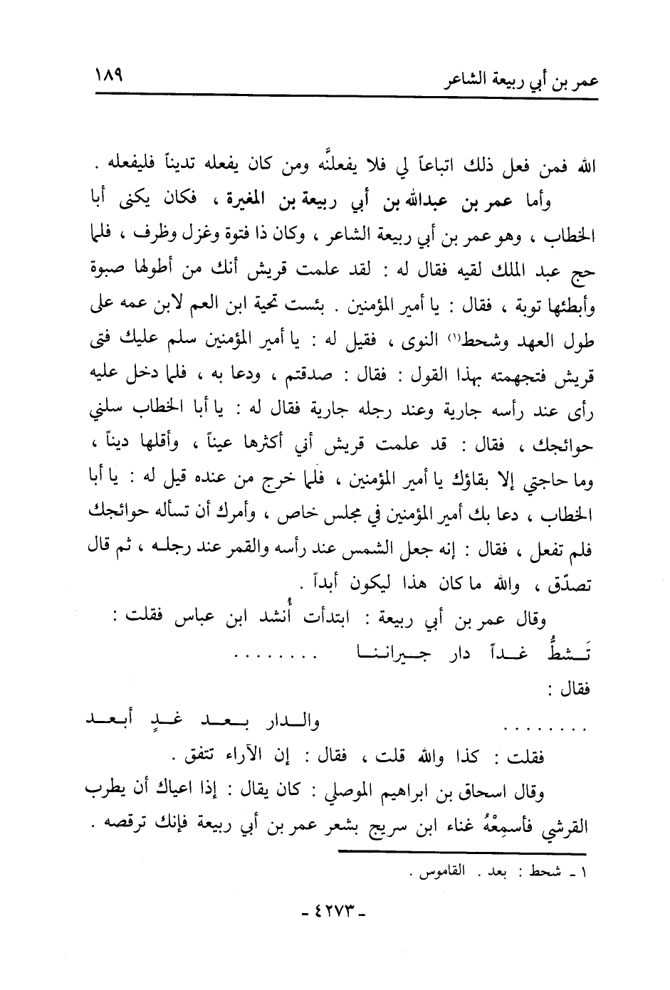 فكان يكنى أبا الخطاب، وَهُوَ عمر بْن أَبِي رَبِيعَةَ الشاعر، وَكَانَ ذا فتوة وغزل وظرف، فلما حج عَبْد الْمَلِكِ لقيه فَقَالَ لَهُ: لقد علمت قُرَيْش أنك من أطولها صبوة وأبطئها توبة، فَقَالَ: يَا أَمِيرَ الْمُؤْمِنِينَ. بئست تحية ابْن العم لابن عمه عَلَى طول العهد وشحط [1] النوى، فقيل لَهُ: يَا أَمِيرَ الْمُؤْمِنِينَ سلم عليك فتى قُرَيْش فتجهمته بهذا القول: فَقَالَ: صدقتم، ودعا بِهِ، فلما دخل عَلَيْهِ رأى عند رأسه جارية وعند رجله جارية فَقَالَ لَهُ: يَا أبا الخطاب سلني حوائجك، فَقَالَ: قد علمت قُرَيْش أني أكثرها عينا، وأقلها دينا، وَمَا حاجتي إِلا بقاؤك يَا أَمِيرَ الْمُؤْمِنِينَ، فلما خرج من عنده قيل لَهُ: يَا أبا الخطاب، دعا بك أَمِير الْمُؤْمِنِينَ فِي مجلس خاص، وأمرك أن تسأله حوائجك فلم تفعل، فَقَالَ: إنه جعل الشمس عند رأسه والقمر عند رجله، ثُمَّ قَالَ تصدق، وَاللَّه مَا كَانَ هَذَا ليكون أبدا.