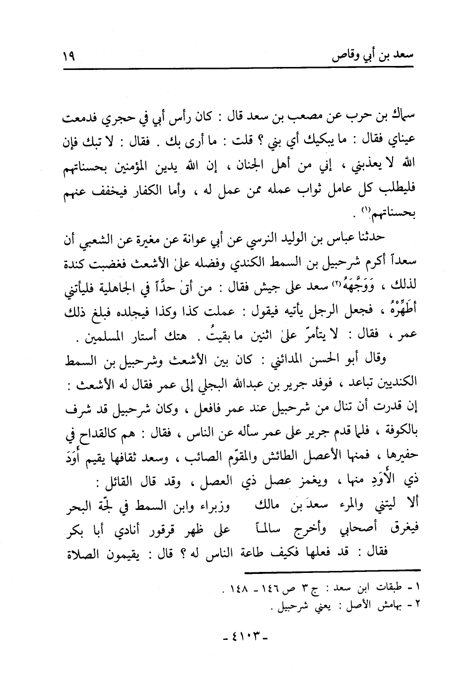 حَدَّثَنَا عَبَّاسُ بْنُ الْوَليِدِ النَّرْسِيُّ عَنْ أَبِي عَوَانَةَ عَنْ مُغِيرَةَ عَنِ الشَّعْبِيِّ أَنَّ سَعْدًا أَكْرَمَ شرحبيل بن السمط الكندي وَفَضَّلَهُ عَلَى الأَشْعَثِ فَغَضِبَتْ كِنْدَةُ لِذَلِكَ، وَوَجَّهَهُ [2] سَعْدٌ عَلَى جَيْشٍ فَقَالَ: مَنْ أَتَى حَدًّا فِي الْجَاهِلِيَّةِ فَلْيَأْتِنِي أُطَهِّرْهُ، فَجَعَلَ الرَّجُلُ يَأْتِيهِ فَيَقُولُ: عَمِلْتُ كَذَا وَكَذَا فَيَجْلِدُهُ فَبَلَغَ ذَلِكَ عُمَرَ، فَقَالَ: لا يَتَأَمَّرُ عَلَى اثْنَيْنِ مَا بَقِيتُ. هَتَكَ أَسْتَارَ الْمُسْلِمِينَ.