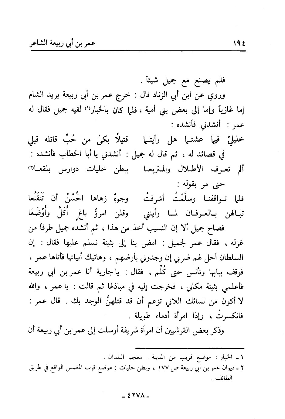 [2] ديوان عمر بن أبي ربيعة ص 177، وبطن حليات: موضع قرب المغمس الواقع في طريق الطائف.