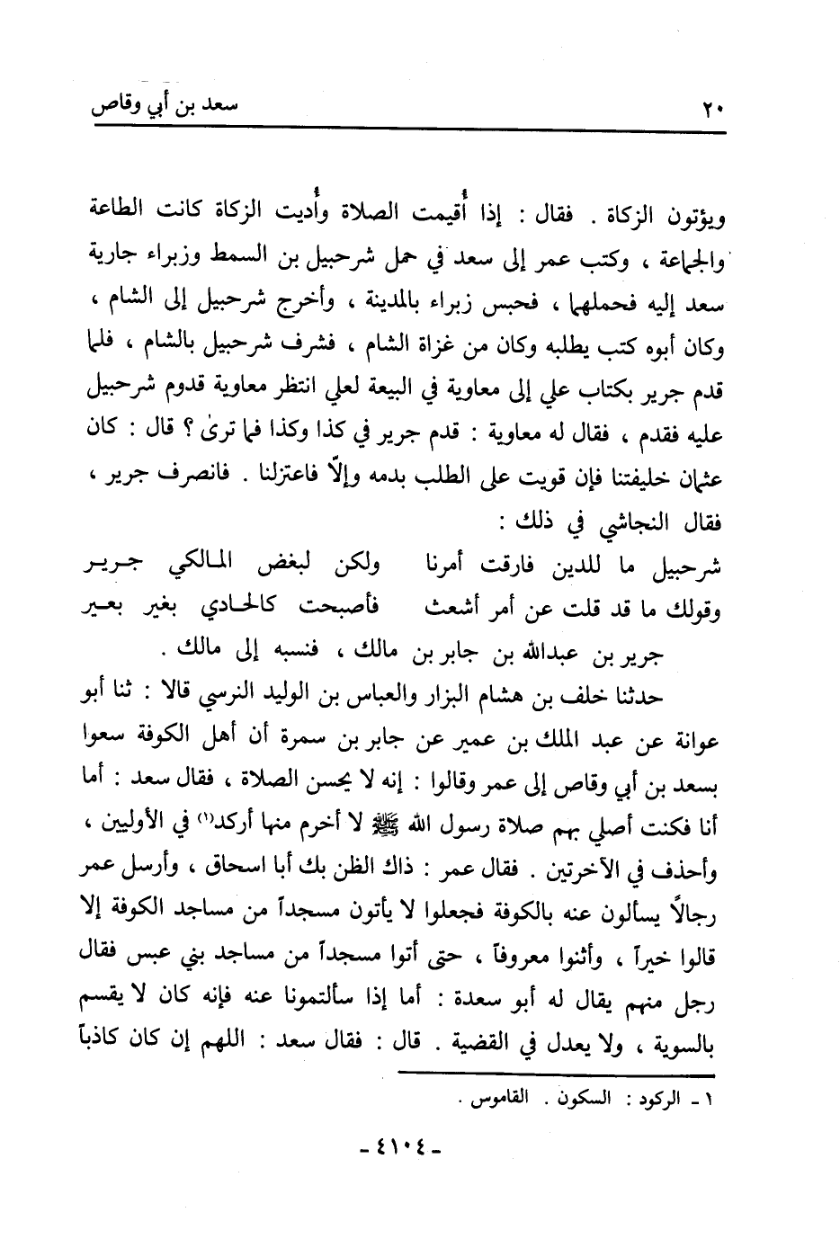 حَدَّثَنَا خَلَفُ بْنُ هِشَامٍ الْبَزَّارِ وَالْعَبَّاسُ بْنُ الْوَليِدِ النَّرْسِيُّ قَالا: ثنا أَبُو عَوَانَةَ عَنْ عَبْدِ الْمَلِكِ بْنِ عُمَيْرٍ عَنْ جَابِرِ بْنِ سَمُرَةَ أَنَّ أَهْلَ الْكُوفَةِ سَعَوْا بِسَعْدِ بْنِ أَبِي وَقَّاصٍ إِلَى عُمَرَ وَقَالُوا: إِنَّهُ لا يُحْسِنُ الصَّلاةَ، فَقَالَ سَعْدٌ: أَمَّا أَنَا فَكُنْتُ أُصَلِّي بِهِمْ صَلاةَ رَسُول اللَّهِ صَلَّى اللَّهُ عَلَيْهِ وَسَلَّمَ لا أَخْرِمُ مِنْهَا أَرْكُدُ [1] فِي الأُولَيَيْنِ، وَأَحْذِفُ فِي الآخِرَتَيْنِ. فَقَالَ عُمَرُ: ذَاكَ الظَّنُّ بِكَ أَبَا إِسْحَاقَ، وَأَرْسَلَ عُمَرُ رِجَالا يَسْأَلُونَ عَنْهُ بِالْكُوفَةِ فَجَعَلُوا لا يَأْتُونَ مَسْجِدًا مِنْ مَسَاجِدِ الْكُوفَةِ إِلا قَالُوا خَيْرًا، وَأَثْنَوْا مَعْرُوفًا، حَتَّى أَتَوْا مَسْجِدًا مِنْ مَسَاجِدِ بَنِي عَبْسٍ فَقَالَ رَجُلٌ مِنْهُمْ يُقَالُ لَهُ أَبُو سَعْدَةَ: أَمَّا إِذَا سَأَلْتُمُونَا عَنْهُ فَإِنَّهُ كَانَ لا يَقْسِمُ بِالسَّوِيَّةِ، وَلا يَعْدِلُ فِي الْقَضِيَّةِ. قَالَ: فَقَالَ سَعْدٌ: اللَّهُمَّ إن كان كاذبا