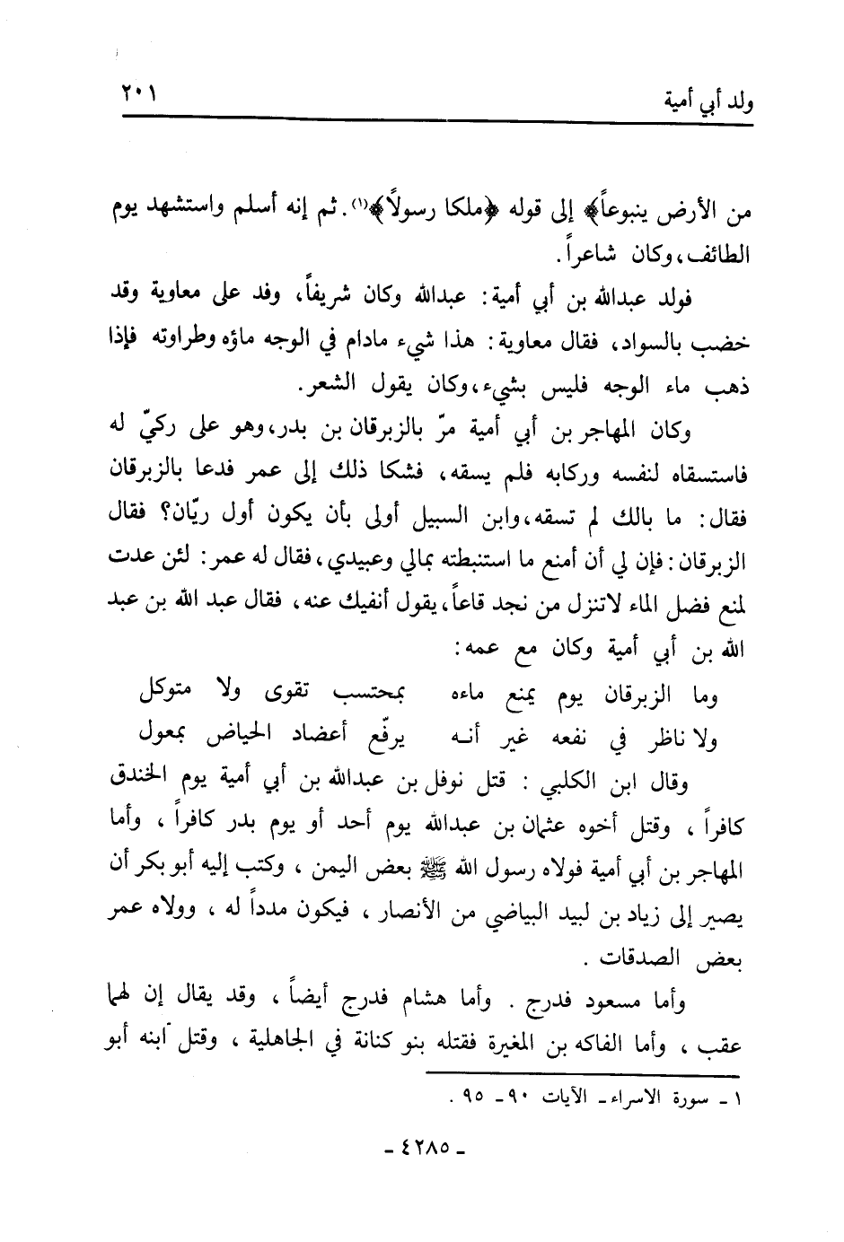 من الأرض ينبوعا) إلى قوله (ملكا رسولا) [1] . ثُمَّ إنه أسلم واستشهد يَوْم الطائف، وَكَانَ شاعرا.