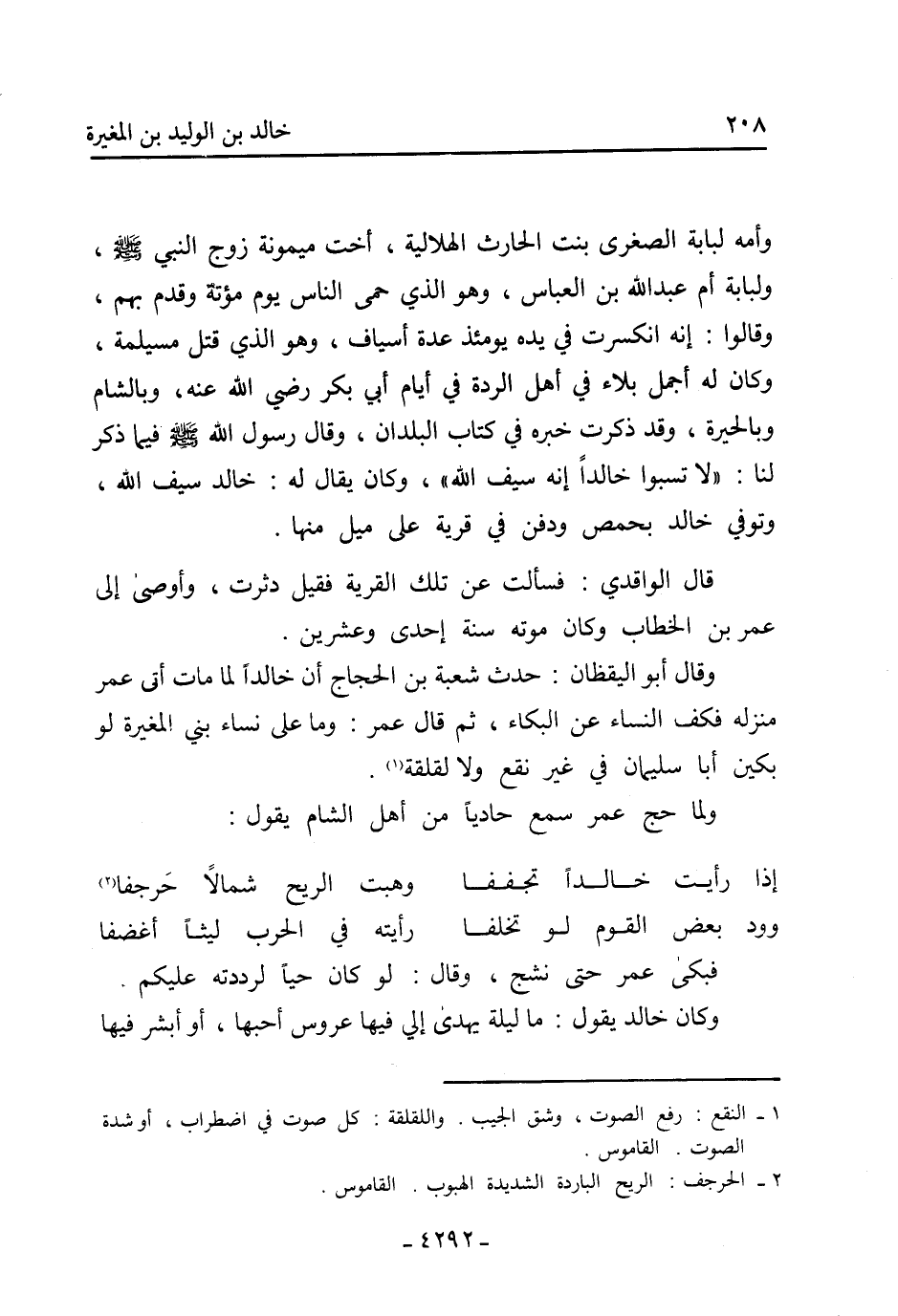 وأمه لبابة الصغرى بِنْت الْحَارِث الهلالية، أخت مَيْمُونَةَ زَوْجَ النَّبِيِّ صَلَّى اللَّهُ عَلَيْهِ وَسَلَّمَ، ولبابة أم عَبْد اللَّهِ بْن الْعَبَّاس، وَهُوَ الَّذِي حمى النَّاس يَوْم مؤتة وقدم بهم، وَقَالُوا: إنه انكسرت فِي يده يومئذ عدة أسياف، وَهُوَ الَّذِي قتل مسيلمة، وَكَانَ لَهُ أجمل بلاء فِي أهل الردة فِي أيام أَبِي بَكْر رَضِيَ اللَّهُ عَنْهُ، وبالشام وبالحيرة، وقد ذكرت خبره فِي كتاب البلدان، وَقَالَ رَسُولُ اللَّهِ صَلَّى اللَّهُ عَلَيْهِ وَسَلَّمَ فِيمَا ذكر لنا: [ «لا تسبوا خالدا إنه سيف اللَّه» ،] وَكَانَ يقال لَهُ: خَالِد سيف اللَّه، وتوفي خَالِد بحمص ودفن فِي قرية عَلَى ميل مِنْهَا.