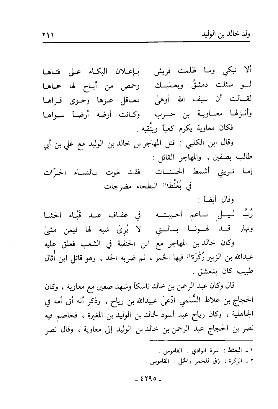 وَقَالَ ابْن الْكَلْبِيّ: قتل المهاجر بْن خَالِد بْن الْوَليِد مَعَ عَلِيّ بْن أَبِي طالب بصفين، والمهاجر القائل: