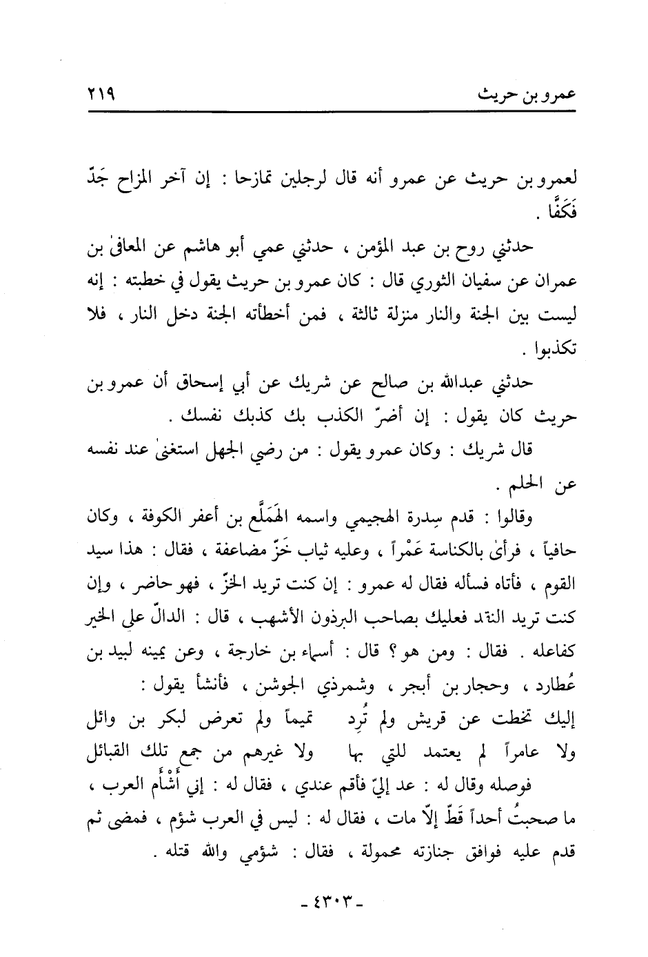 حَدَّثَنِي رَوْحُ بْن عَبْدِ الْمُؤْمِنِ، حَدَّثَنِي عَمِّي أَبُو هَاشِمٍ عَنِ الْمُعَافَى بْنِ عِمْرَانَ عَنْ سُفْيَانَ الثَّوْرِيِّ قَالَ: كَانَ عَمْرُو بْنُ حُرَيْثٍ يَقُولُ فِي خُطْبَتِهِ: إِنَّهُ لَيْسَتْ بَيْنَ الْجَنَّةِ وَالنَّارِ مَنْزِلَةٌ ثَالِثَةٌ، فَمَنْ أَخْطَأَتْهُ الْجَنَّةُ دَخَلَ النَّارَ، فَلا تَكْذِبُوا.