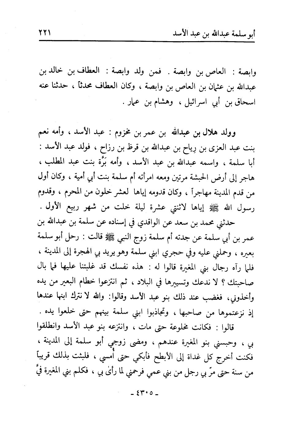 حَدَّثَنِي مُحَمَّد بْن سَعْد عَنِ الْوَاقِدِيِّ فِي إِسْنَادِهِ عَنْ سَلَمَةَ بْنِ عَبْدِ اللَّهِ بْنِ عُمَرَ بْنِ أَبِي سَلَمَةَ عَنْ جَدَّتِهِ أُمِّ سَلَمَةَ زَوْجِ النَّبِيّ صَلَّى اللَّهُ عَلَيْهِ وَسَلَّمَ قَالَتْ: رَحَّلَ أَبُو سَلَمَةَ بَعِيرَهُ، وَحَمَلَنِي عَلَيْهِ وَفِي حِجْرِي ابْنِي سَلَمَةُ وَهُوَ يُرِيدُ بِي الْهِجْرَةَ إِلَى الْمَدِينَةِ، فَلَمَّا رَآهُ رِجَالُ بَنِي الْمُغِيرَةِ قَالُوا لَهُ: هَذِهِ نفسُك قَدْ غلبتَنا عَلَيْهَا فَمَا بَالُ صَاحِبَتِكَ؟ لا نَدَعُكَ وَتَسْيِيرِهَا فِي الْبِلادِ، ثُمَّ انْتَزَعُوا خِطَامَ الْبَعِيرِ مِنْ يَدِهِ وَأَخَذُونِي، فَغَضِبَ عِنْدَ ذَلِكَ بَنُو عَبْدِ الأَسَدِ وَقَالُوا: وَاللَّهِ لا نَتْرُكُ ابْنَهَا عِنْدَهَا إِذْ نَزَعْتُمُوهَا مِنْ صَاحِبِهَا، وَتَجَاذَبُوا ابْنِي سَلَمَةَ بَيْنَهُمْ حَتَّى خَلَعُوا يَدَهُ.