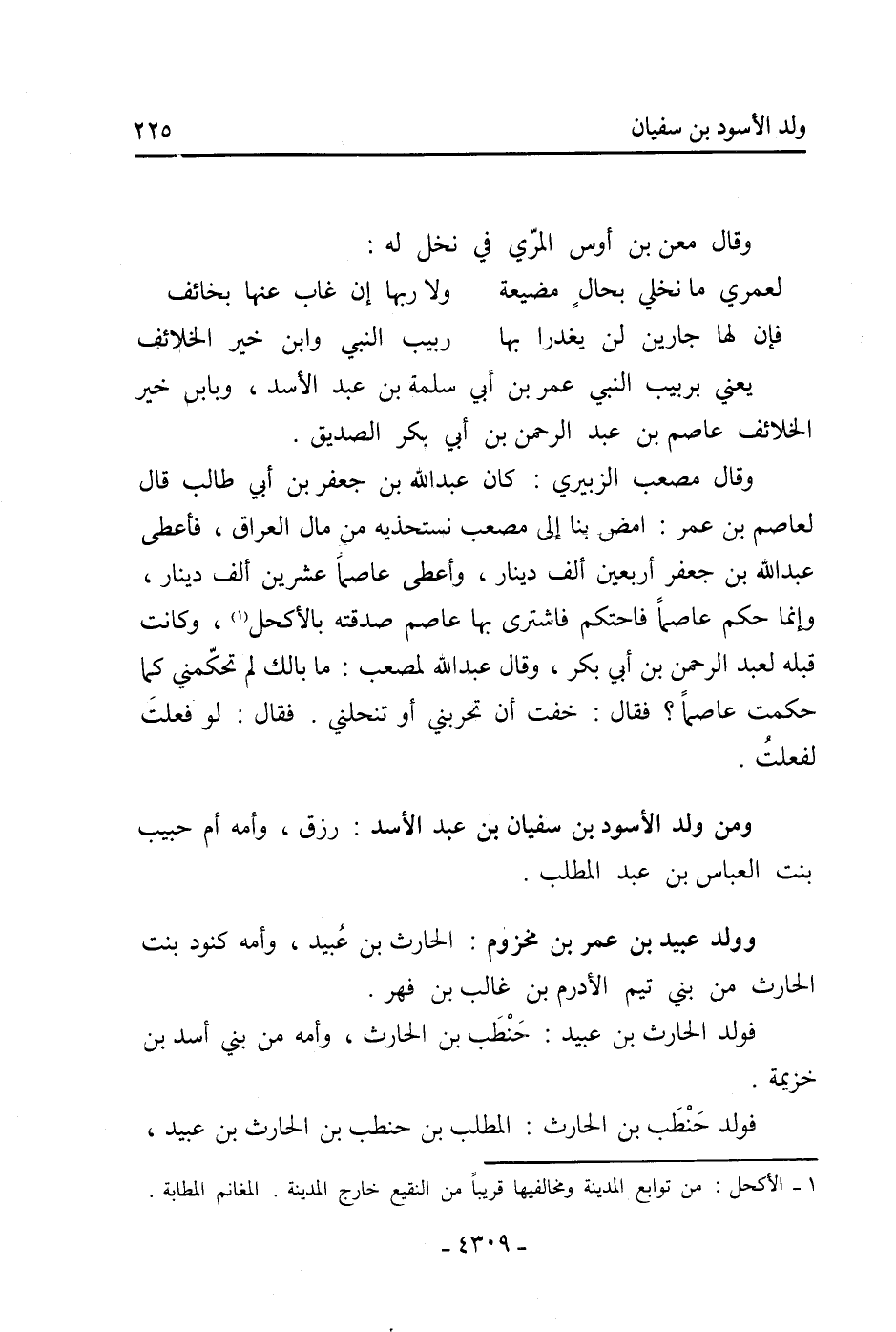 وَقَالَ مصعب الزُّبَيْرِيّ: كَانَ عَبْد اللَّهِ بْن جَعْفَر بْن أَبِي طالب قَالَ لعاصم بْن عُمَرَ: امض بنا إِلَى مصعب نستحذيه من مال العراق، فأعطى عَبْد اللَّهِ بْن جَعْفَر أربعين ألف دينار، وأعطى عاصما عشرين ألف دينار، وإنما حكم عاصما فاحتكم فاشترى بِهَا عَاصِم صدقته بالأكحل [1] ، وكانت قبله لِعَبْدِ الرَّحْمَنِ بْن أَبِي بَكْر، وَقَالَ عَبْد اللَّهِ لمصعب: مَا بالك لم تحكمني كما حكمت عاصما؟ فَقَالَ: خفت أن تحربني أَوْ تنحلني. فَقَالَ: لو فعلت لفعلت.
