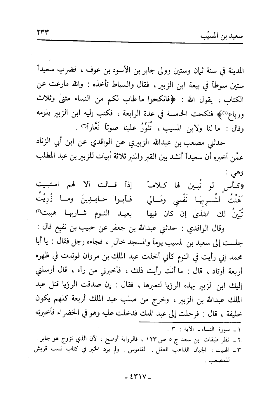 الْمَدِينَة فِي سنة ثمان وستين وولى جابر بْن الأسود بْن عَوْفٍ، فضرب سعيدا ستين سوطا فِي بيعة ابْن الزُّبَيْر، فَقَالَ والسياط تأخذه: والله مارغت عَن الكتاب، يَقُول اللَّه: (فَانْكِحُوا مَا طَابَ لكم من النساء مثنى وثلاث ورباع) [1] فنكحت الخامسة فِي عدة الرابعة، فكتب إِلَيْهِ ابْن الزُّبَيْر يلومه وَقَالَ: مَا لنا ولابن المسيب، تثور علينا صوتا نعارا [2] .