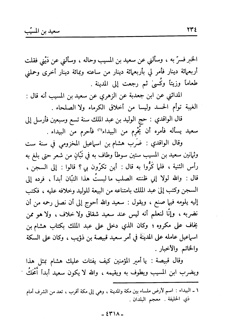 وَقَالَ الْوَاقِدِيُّ: ضرب هِشَام بْن إِسْمَاعِيل المخزومي في سنة ست وثمانين سعيد بن المسيب ستين سوطا وطاف بِهِ فِي تبان من شعر حَتَّى بلغ بِهِ رأس الثنية، فلما كروا بِهِ قَالَ: أين تكرون بي؟ قَالُوا: إلى السجن، قال: والله لولا إني ظننته الصلب ما لبست هذا التبان أبدا، فرده إِلَى السجن وكتب إِلَى عَبْد الْمَلِكِ بامتناعه من البيعة للوليد وخلافه عَلَيْهِ، فكتب إِلَيْهِ يلومه فيما صنع، ويقول: سَعِيد وَاللَّه أحوج إِلَى أن نصل رحمه من أن نضربه، وإنا لنعلم أنه ليس عند سَعِيد شقاق وَلا خلاف، وَلا هُوَ ممن يخاف عَلَى مكروه، وَكَانَ الَّذِي دخل عَلَى عَبْد الْمَلِكِ بكتاب هِشَام بْن إِسْمَاعِيل عامله عَلَى الْمَدِينَة فِي أمر سَعِيد قَبِيصَة بْن ذؤيب، وَكَانَ عَلَى السكة والخاتم والأخبار.