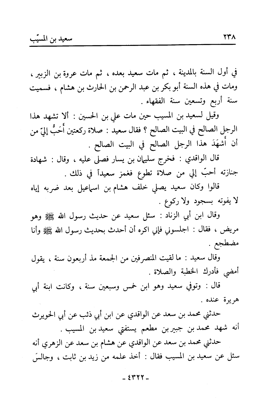 وقيل لسعيد بْن الْمُسَيِّبِ حين مات عَلِيّ بْن الْحُسَيْن: أَلا تشهد هَذَا الرجل الصالح فِي البيت الصالح؟ فَقَالَ سَعِيد: صلاة ركعتين أحب إلي من أن أشهد هَذَا الرجل الصالح فِي البيت الصالح.
