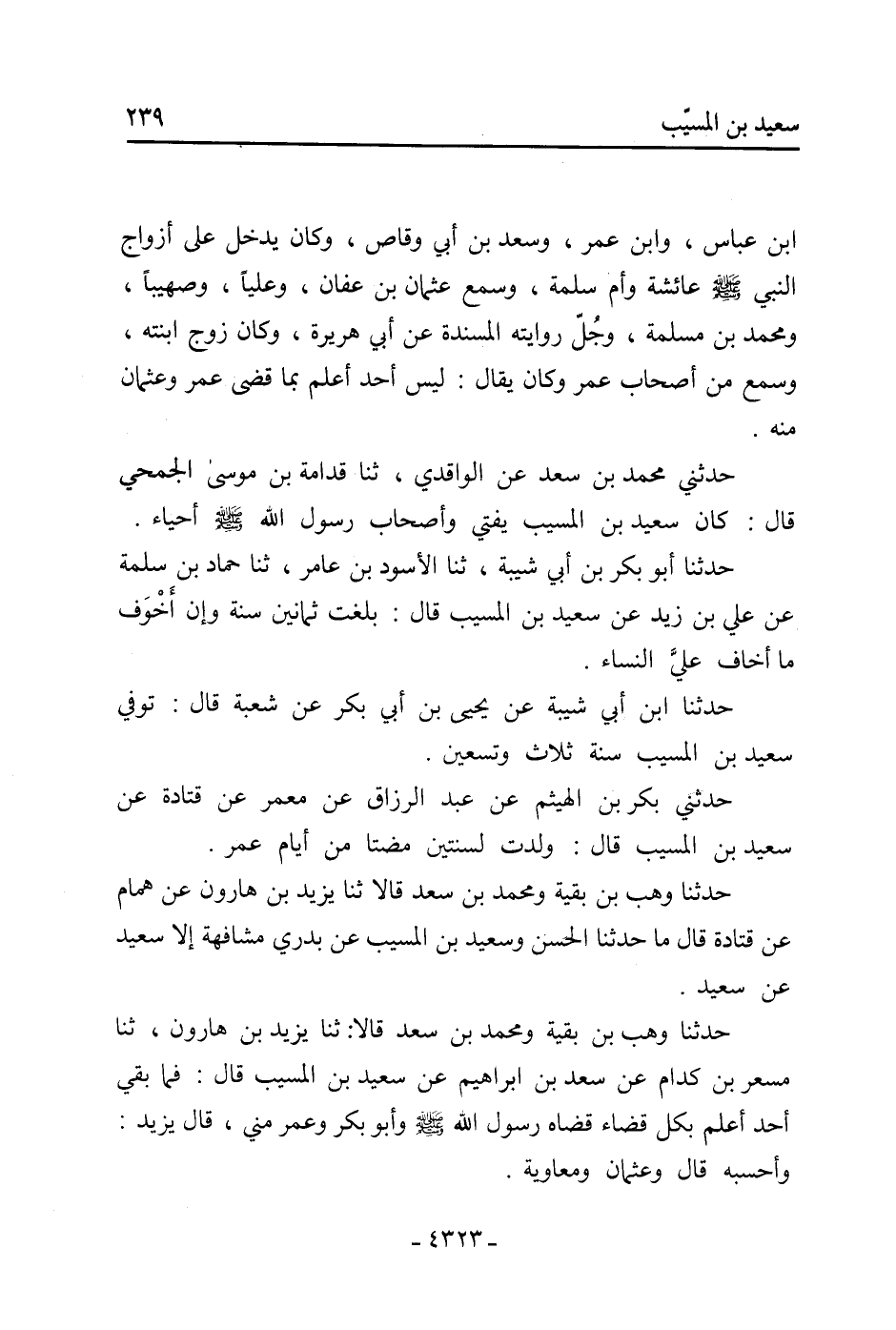 حَدَّثَنَا وهب بْن بقية وَمُحَمَّد بْن سَعْد قَالا: ثنا يَزِيدُ بْنُ هَارُونَ، ثنا مسعر بْن كدام عَن سَعْد بْن إِبْرَاهِيمَ عَنْ سَعِيدِ بْنِ الْمُسَيِّبِ قَالَ: فما بقي أحد أعلم بكل قضاء قضاه رَسُول اللَّهِ صَلَّى اللَّهُ عَلَيْهِ وَسَلَّمَ وَأَبُو بكر وعمر مني، قَالَ يَزِيد: