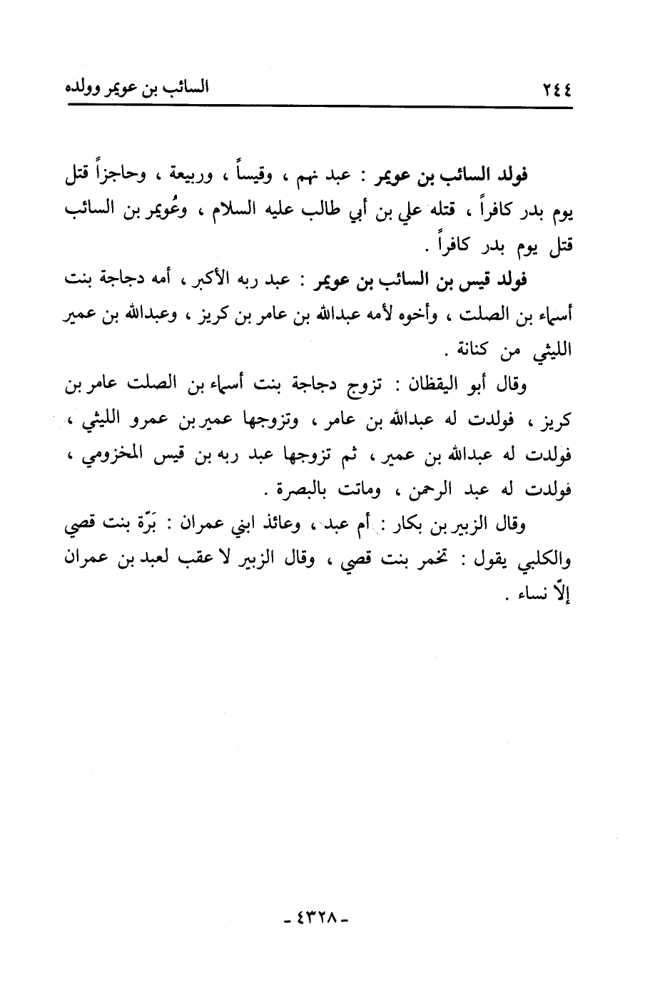 فولد السائب بن عويمر: عبدنهم، وقيسا، وربيعة، وحاجزا قتل يَوْم بدر كافرا، قتله عَلِيّ بْن أَبِي طالب عَلَيْهِ السلام، وعويمر بْن السائب قتل يَوْم بدر كافرا.