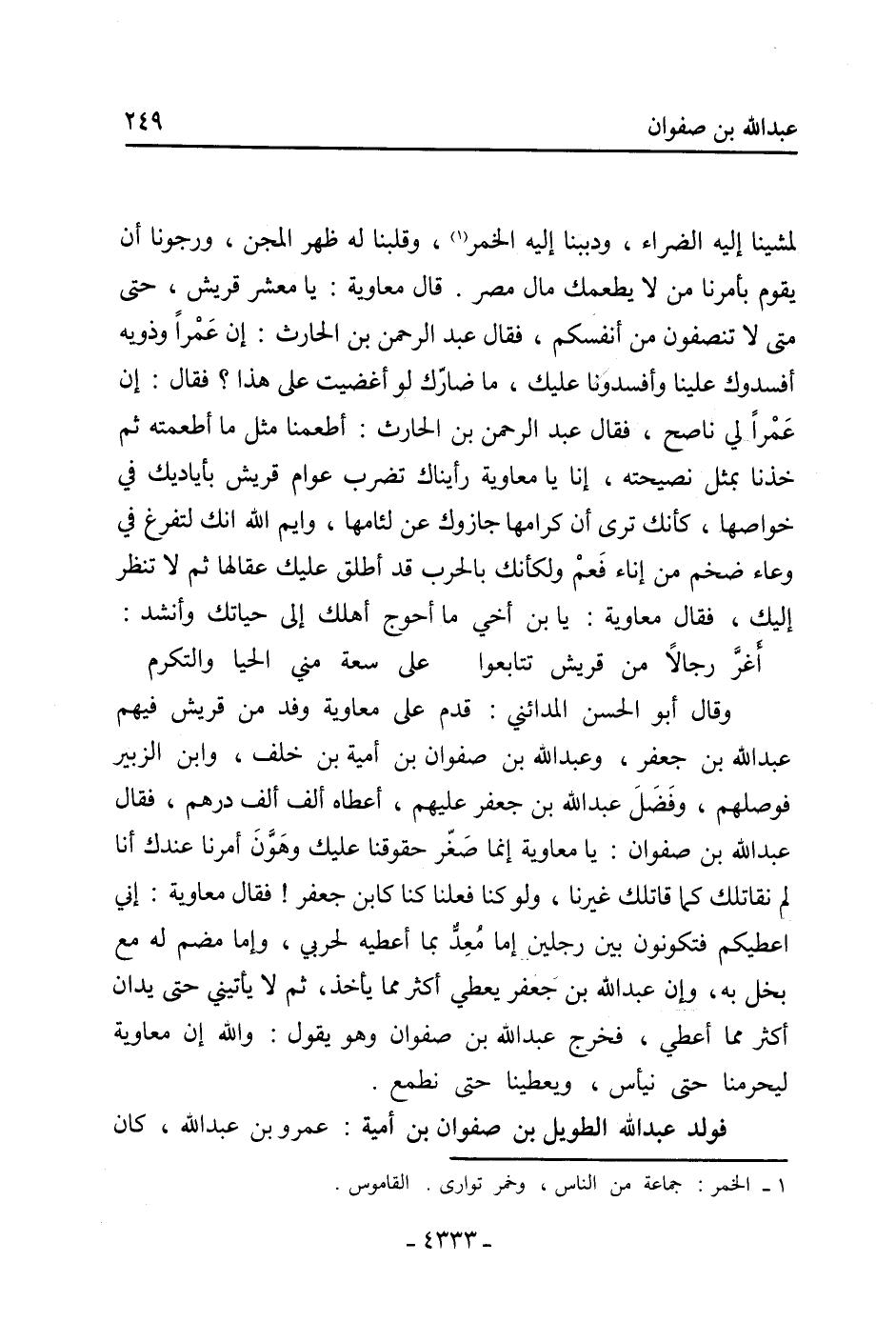 وَقَالَ أَبُو الْحَسَنِ الْمَدَائِنِيّ: قدم عَلَى مُعَاوِيَة وفد من قُرَيْش فيهم عَبْدُ اللَّهِ بْنُ جَعْفَرٍ، وَعَبْدُ اللَّهِ بْنُ صفوان بْن أمية بْن خلف، وَابْن الزُّبَيْرِ فَوَصَلَهُمْ، وَفَضَّلَ عَبْدَ اللَّهِ بْنَ جَعْفَرٍ عَلَيْهِم، أعطاه ألف أَلْفَ دِرْهَمٍ، فَقَالَ عَبْدُ اللَّهِ بْنُ صَفْوَانَ: يَا مُعَاوِيَة إنما صغر حقوقنا عليك وهون أمرنا عندك أنا لَمْ نُقَاتِلْكَ كَمَا قَاتَلَكَ غَيْرُنَا، وَلَوْ كُنَّا فَعَلْنَا كُنَّا كَابْنِ جَعْفَر! فَقَالَ مُعَاوِيَةُ: إِنِّي أعطيكم فتكونون بين رجلين إما معد بما أعطيه لحربي، وإما مضم لَهُ مَعَ بُخْلٍ بِهِ، وَإِنَّ عَبْدَ اللَّهِ بْن جَعْفَر يعطي أكثر مما يأخذ، ثُمَّ لا يأتيني حَتَّى يدان أكثر مما أعطي، فخرج عَبْد اللَّهِ بْن صفوان وَهُوَ يَقُول: وَاللَّه إِنَّ مُعَاوِيَةَ لَيَحْرِمُنَا حَتَّى نَيْأَسَ، وَيُعْطِينَا حَتَّى نطمع.